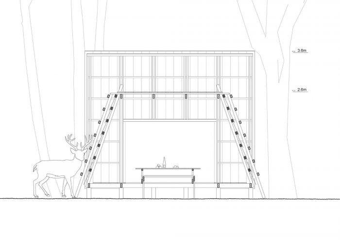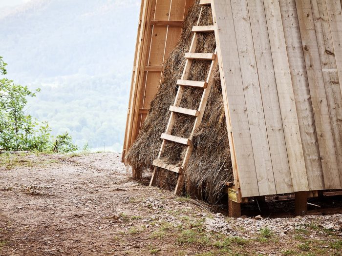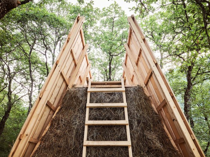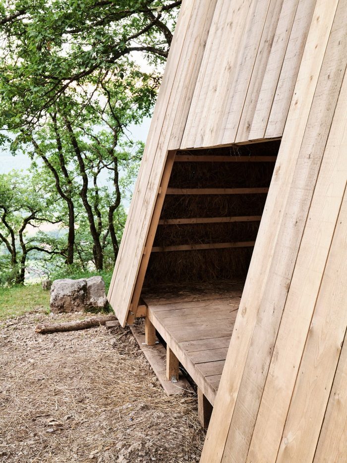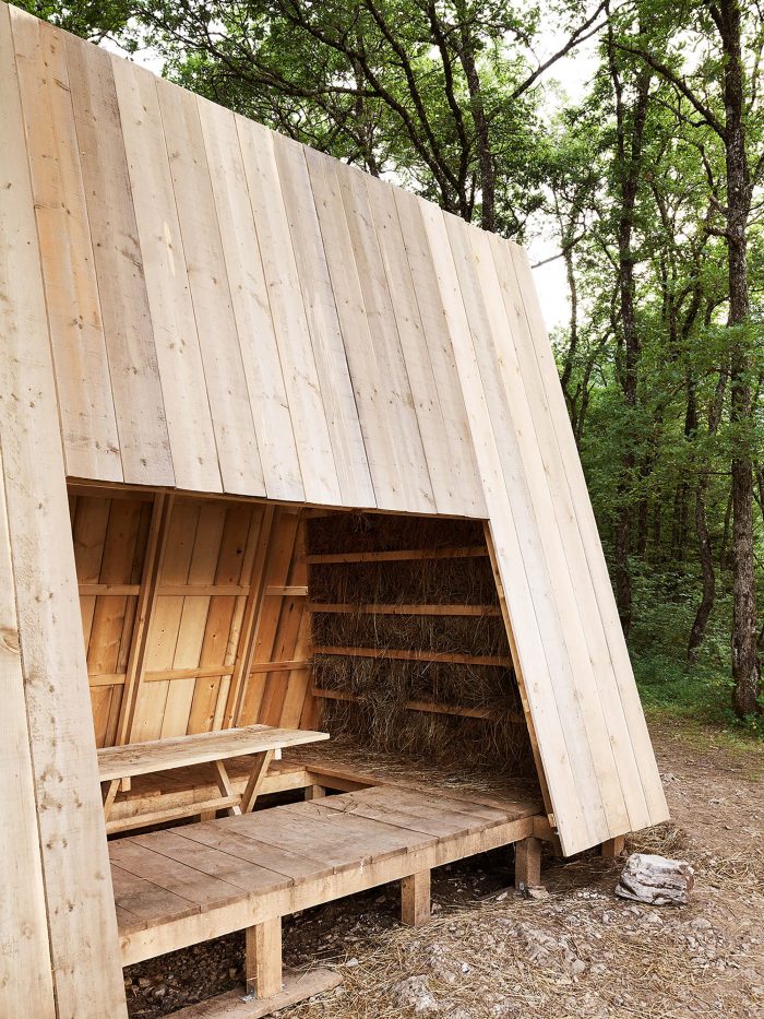 The hut integrates an existing table protected by two wooden roofs and two walls made of hay. The hay is also used as food that attracts wild animals, enhancing the probability of meetings between humans and wildlife.