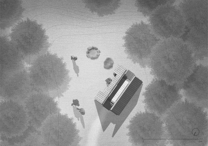 The access path to the site is extended by the accessible roof of the cabin which becomes the climax of the promenade. Visitors are invited to climb and admire the view before resting inside.