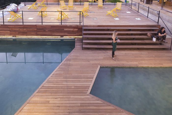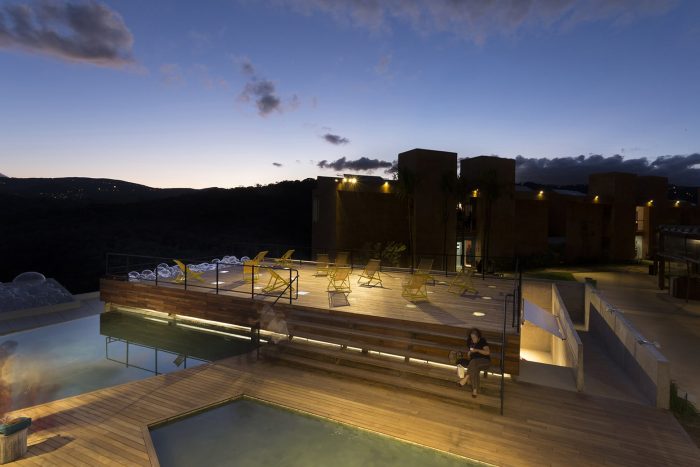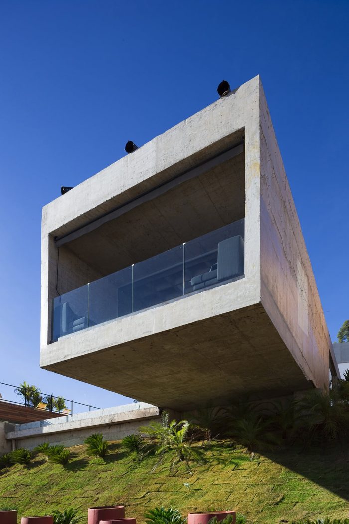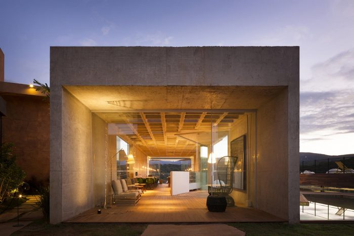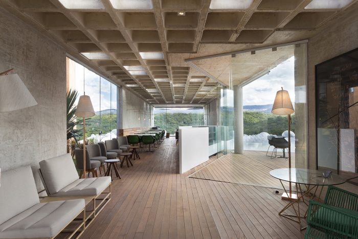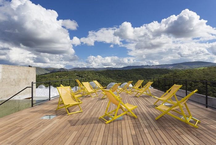 Designed and built over just three months, the “Bar-Pool-Gallery” was planned for the Casa Cor MG 2014 as a kind of a hilltop belvedere. The site is located in the central area of a private weekend retreat development, a series of bungalows with hotel infrastructure scattered on a sloping mountain overlooking the stunning valleys of Nova Lima, 12 km away from the city of Belo Horizonte.