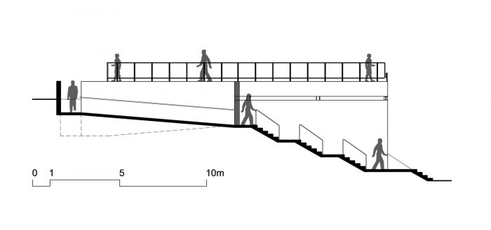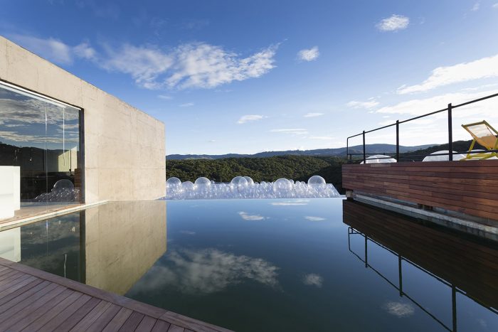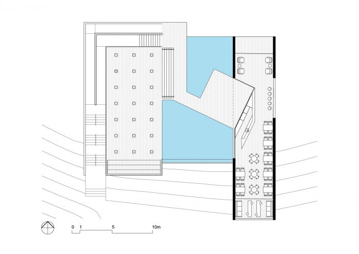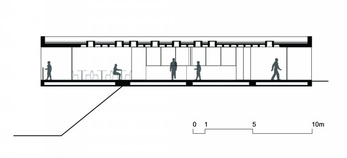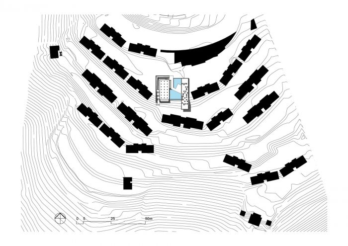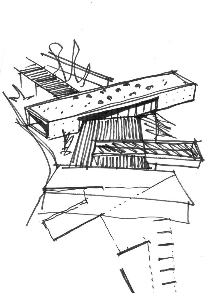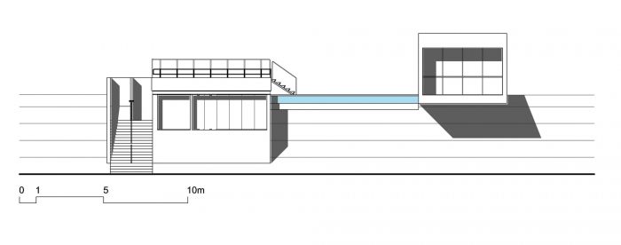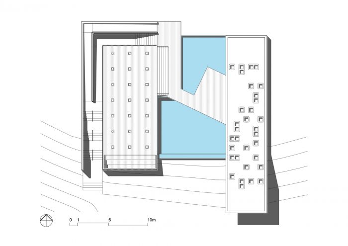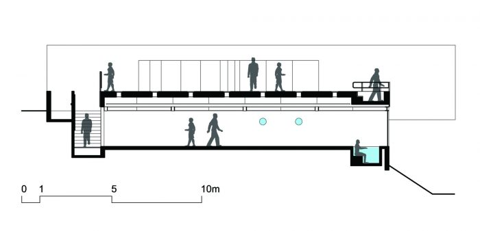 The Gallery is the only “semi-buried” structure of the development. This strategy allowed open views from the landscape, and the use of the roof as a split-level observatory deck, which is an extension of the swimming-pool deck.