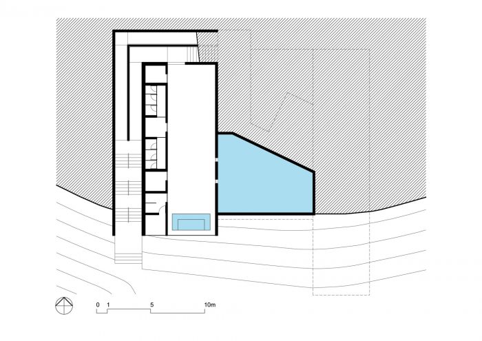 两个原始的混凝土盒子组成了该建筑:一个由楼板和墙壁组成,另一个由屋顶板和横梁组成。钢柱使两个盒子之间有一个水平的间隙,为室内带来一束光,同时也带来了游泳池的景色。通道的坡道和楼梯与景观相映成趣,当你接近下沉空间时,隐藏和显露的景色,最终在内部形成一个完整的开口,以类似于酒吧的方式将景色框起来。