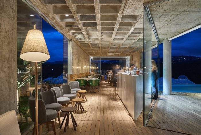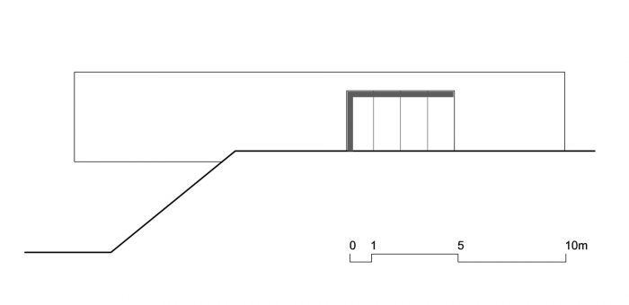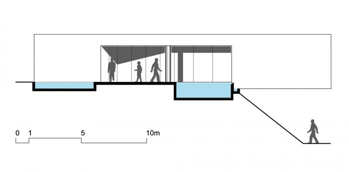 Two raw concrete boxes compose the building: one formed by the floor slab and walls, and the other one formed by the roof slab and beams. Steel columns allow a horizontal gap between the two boxes, bringing a beam of light to the interior as well as views from the swimming pool. The access ramps and stairs play with the landscape, hiding away and revealing views as you approach the sunken space, culminating in a complete opening on the interior that frames the view in a way similar to the Bar’s.
