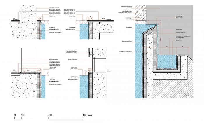 Inside, there is a sequence os places from one end to the other of the tube: veranda (entry porch), lounge, indoor-outdoor bar, main sitting area and, on the end of the cantilever, another veranda framing the landscape. The ribbed pre-cast slab of the ceiling suggested a series of “pixilated” openings to flood the core with soft natural light, while the floor is treated an extension of the swimming pool’s wooden deck. Simple furniture pieces and delicate lighting fixtures fits the interior of the bar (by Ana Bahia), giving it a casual and informal feel.
