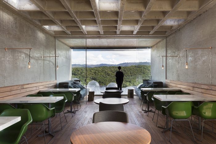 The Bar is basically a raw concrete “square tube” structure with a cantilever spanning 10m over the site’s slope, pointing out to the landscape. In contrast to its neighbors, identical bungalows that are accommodated according to the contour lines, the horizontal volume of the bar sticks out against the steep topography (north-south orientation), opening up enough space for the pool and deck, which unfolds on the rooftop of the Gallery. The structure is an extremely simple volume (a 3x5x5m prism) as opposed to the pitched roof two-storey bungalows from the condominium, with few stark materials and almost no finishes.
