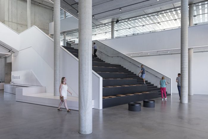 The new Headquarters is a platform for connection and collaborative work. The 13,250 square-meter building contains a public canteen, flexible collaboration spaces, dedicated work areas, a gym, and a rooftop terrace with views of the Alps. The spaces are organized around a dynamic interior atrium whose rotating and overlapping cut-outs create a mix of single, double, and full-height spaces. The atrium creates an energetic social core for the building, and its cascading staircase functions as an informal communication space.