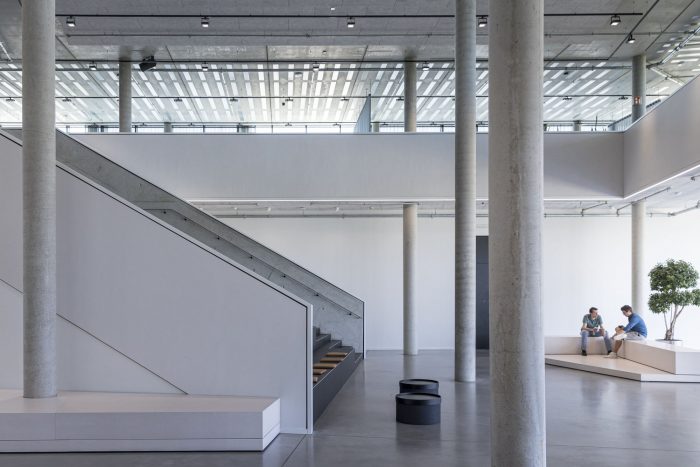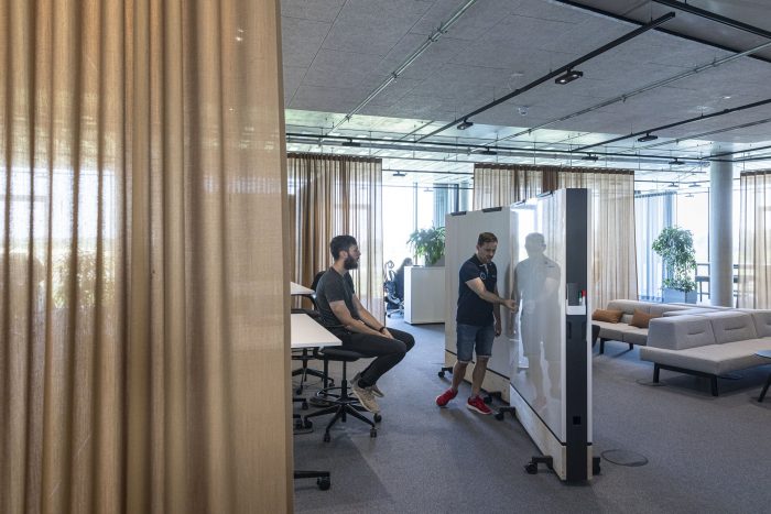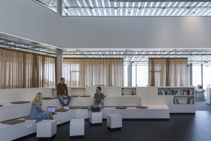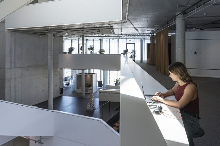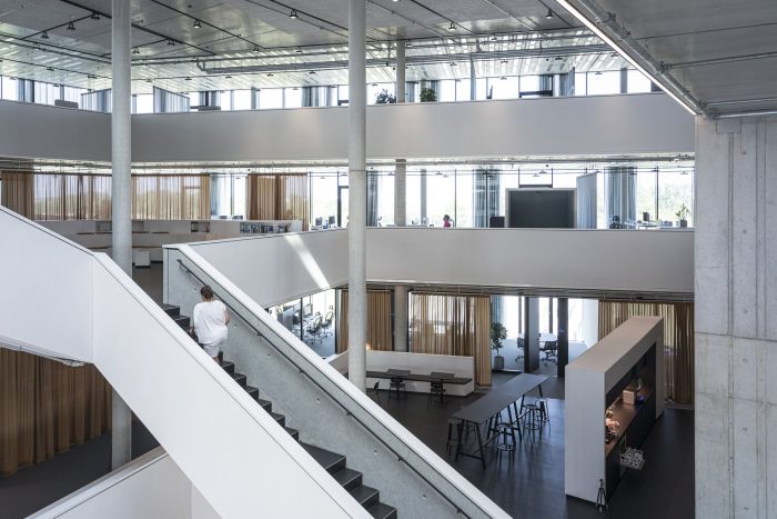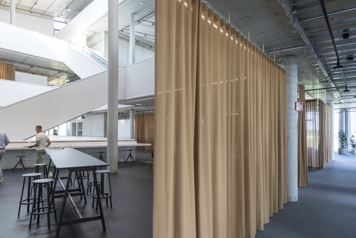 In contrast to the sleek, minimal facade the interior is made of raw, exposed, and natural materials. Exposed concrete, unfinished anodized surface, and visible metal sheets. Workspaces utilize natural colors and materials such as wood and fabric. All the surfaces facing the atrium are clad in a white acoustic coating that dampens sound and amplifies natural, diffused light. Bronze-colored curtains serve as flexible interior partitions to create easily adaptable spaces.