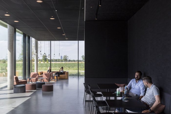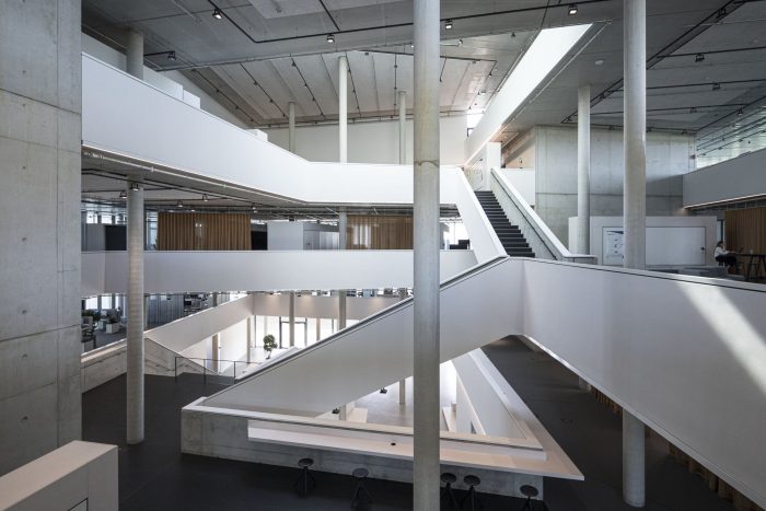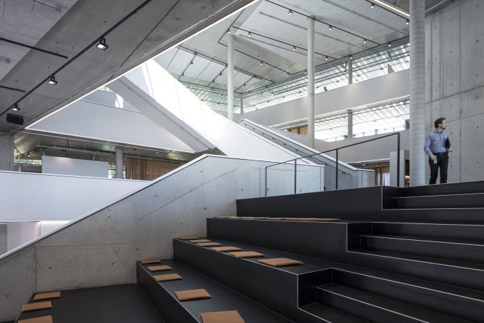 The headquarters’ concrete slabs are thermally activated and use radiant heating to maintain a 21-degree temperature throughout the year, acting as a thermal buffer during the summer and winter. The exposed concrete is inlaid with layered acoustic panels, the perforated metal layer allows for thermal conduction, while the foam layer absorbs sound.