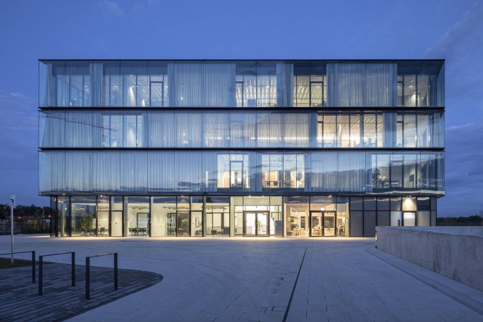baramundi HQ is an agile work environment whose flexibility is expressed in the always-changing character of its facade. The minimal glass volume is articulated with precision strip steel and elegantly reveals, while the semi-automated curtain system offers a playful, yet highly-functional sun-shading system. The system combines low-tech curtains with a high-tech, automated track system. The curtains follow the sun’s path and provide variable degrees of shading for workspaces and lounges