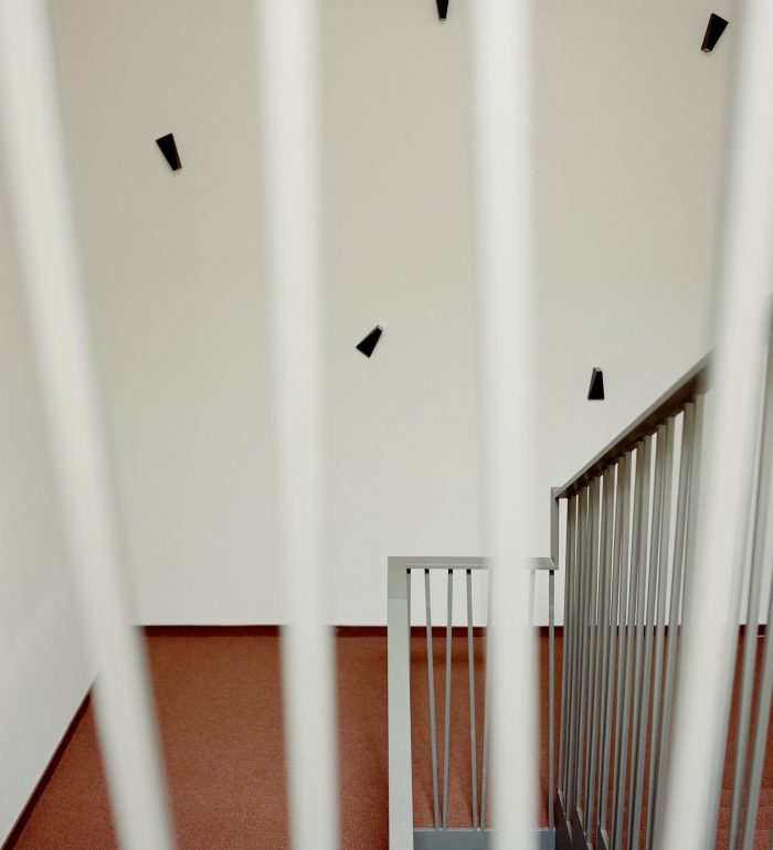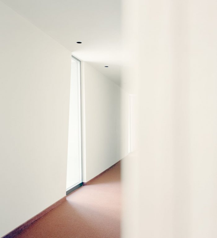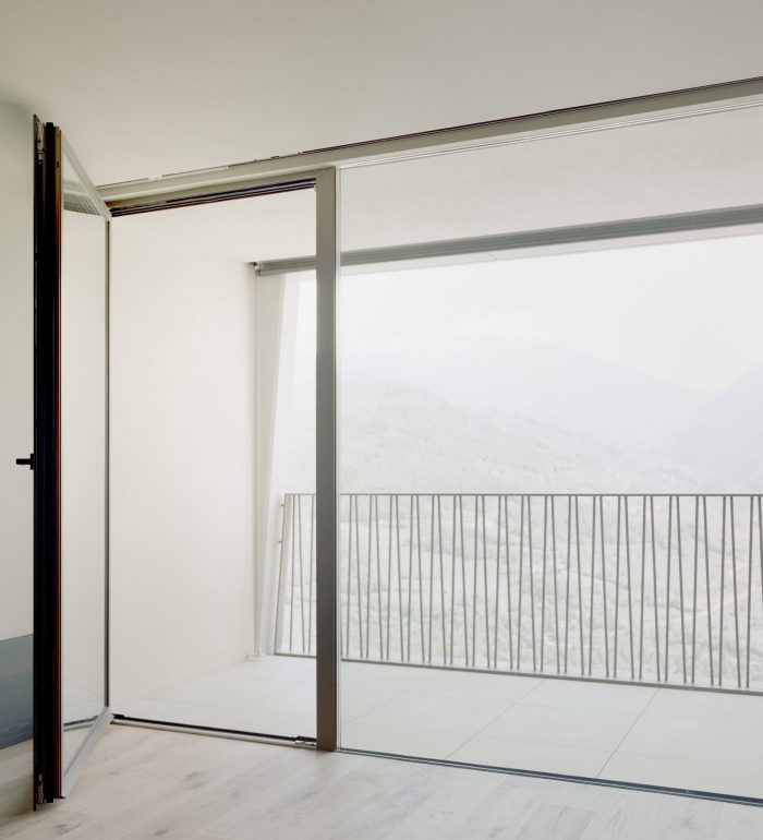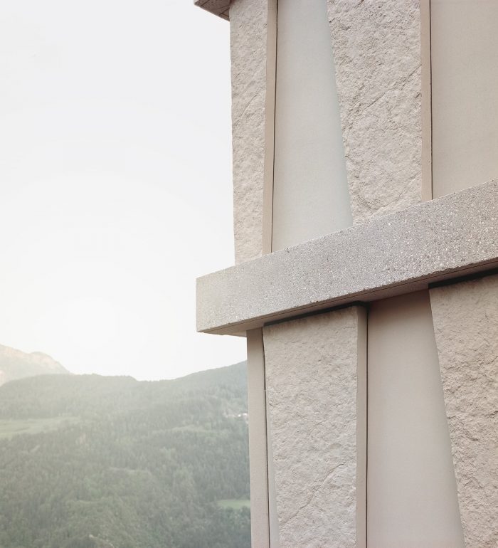 The volume close to the mountain facilitates an extensive view of the valley and the gaze of the Dolomites. The simplicity of the materials and forms, and their peaceful and transparent appearance, are continued inside the hotel.