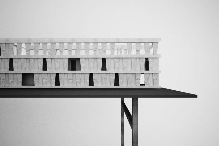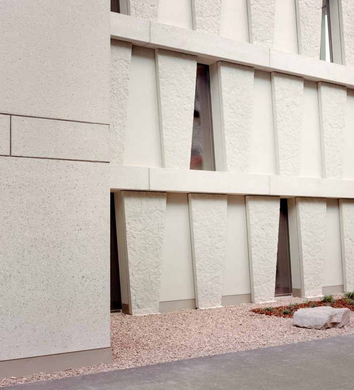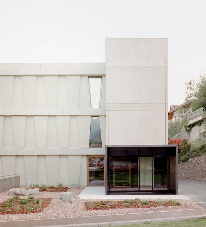 The particular trapezoid identity is reflected in the project. By repeating unique and fundamental elements, the pattern on the facade is given a timeless and archaic character. Concrete, a superb raw material, is used like stone.