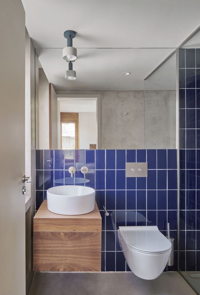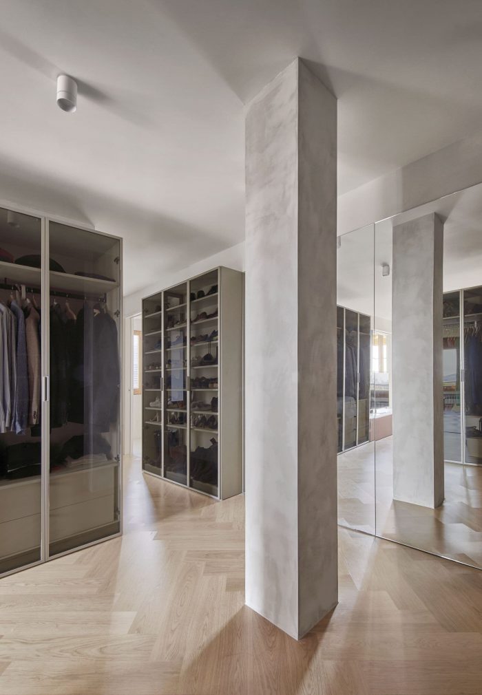 A similar principle of interconnected programs is found within the master bedroom, where the dressing room, bedroom, and study share an open plan, structured only by separate wardrobes and sliding partitions. Large floor-to-ceiling mirrors paired with reflective smoked glass doors create a geometric mirage in the walk-in closet. A mix of powdery and muted palettes punctuated with bold, bold color elements is replicated throughout the apartment, seeking a balanced urban aesthetic in tune with clients' personalities. It was deemed worth saving the wooden window frames, otherwise replacing all finishes.
