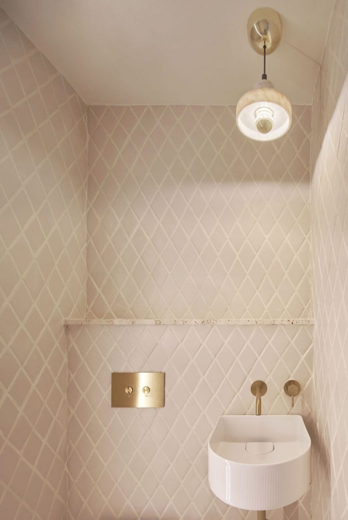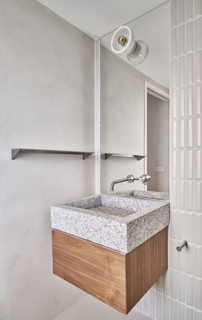 在主卧室内也发现了类似的相互联系的程序原则,更衣室、卧室和书房共享一个开放的平面,仅由独立的衣柜和滑动隔板构成。大型落地镜与反光的烟熏玻璃门搭配,在步入式衣柜中创造了一个几何形状的海市蜃楼。粉色和柔和的调色板与大胆的色彩元素的混合,在整个公寓中被复制,寻求一种平衡的城市美学,与客户的个性相适应。我们认为值得保留木质窗框,否则将更换所有饰面。