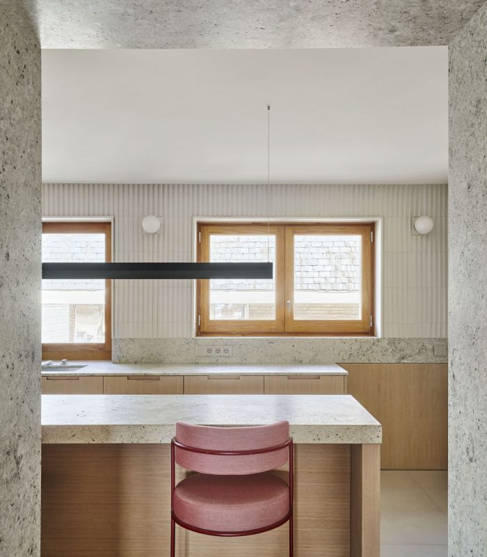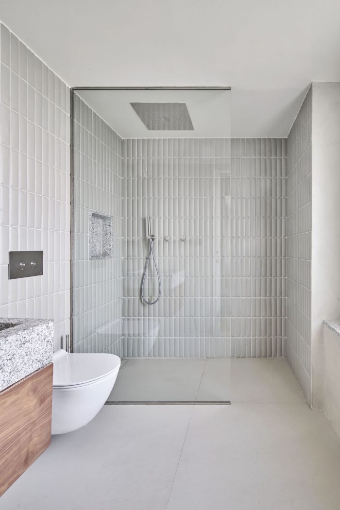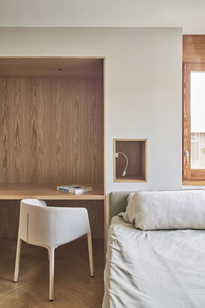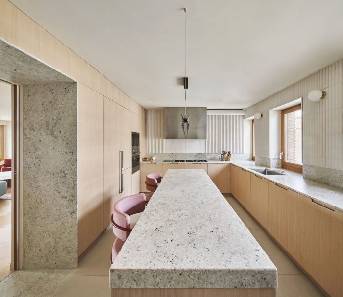 自然材料,如橡木和柚木地板,大理石和花岗岩台面,或陶瓷墙砖被用于整个房子。所有的私人房间都有浴室,沿着周边分组,围绕着完全开放的白天区域。所有的家具,如衣柜、咖啡桌、工作桌和特大号单人床,都是定制设计的,沿墙放置,给人以强烈的空间感。花岗岩和木头包覆的厨房很快就超越了其单纯的功能目的,成为一个用餐、阅读、社交或工作的空间;这一切都得益于其丰富的自然光、温暖的装饰和照明、中央岛和通道的布局。