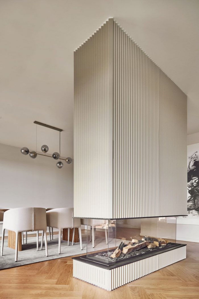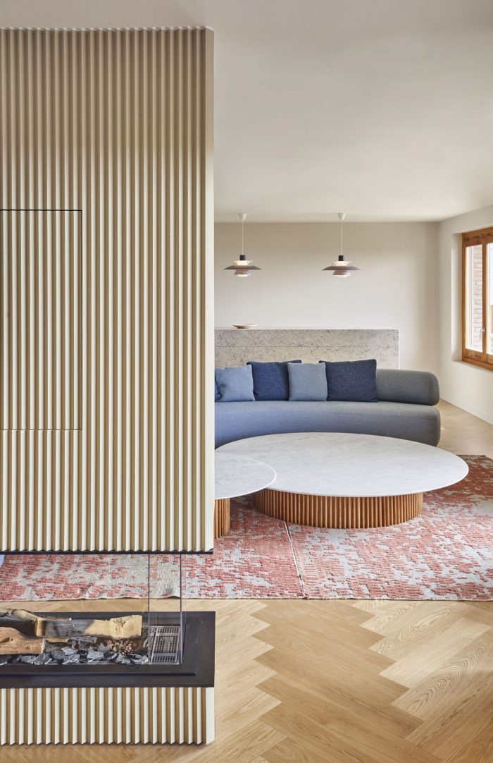 特别注意的是定制设计的枢轴元素,将开放的计划组织成不同的设置。一个高大的花岗岩柜台,三个超大的大理石咖啡桌和一个漂浮的壁炉创造了一系列相互关联的氛围。它们中的每一个都被设想为一个强大的整体元素,要求在其周围有一个自发的浮动循环。通过这种方式,旧的壁炉被从墙上分离出来,成为一个独特的独立的作品。它的水平切割强调了创造铰链的意图,而不是阻断关系。这些组件的阻力被认为是重要的,足以拆除外墙,并在一块放置一个直径为180厘米的大理石桌子。