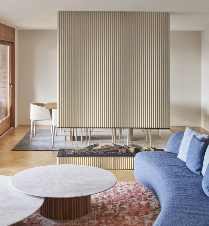 Special attention was paid to custom-designed pivot elements that organize the open plan into different settings. A tall granite counter, three oversized marble coffee tables, and a floating fireplace create a sequence of interrelated atmospheres. Each one of them was conceived as a strong monolithic element that claims a spontaneous floating circulation around it. In this way, the old fireplace was detached from the wall, becoming a unique free-standing piece. Its horizontal cut emphasizes the intention to create hinges instead of blocking relationships. The resistance of these components was considered important enough to dismantle the façade and place a marble table with a diameter of 180 cm in one piece.