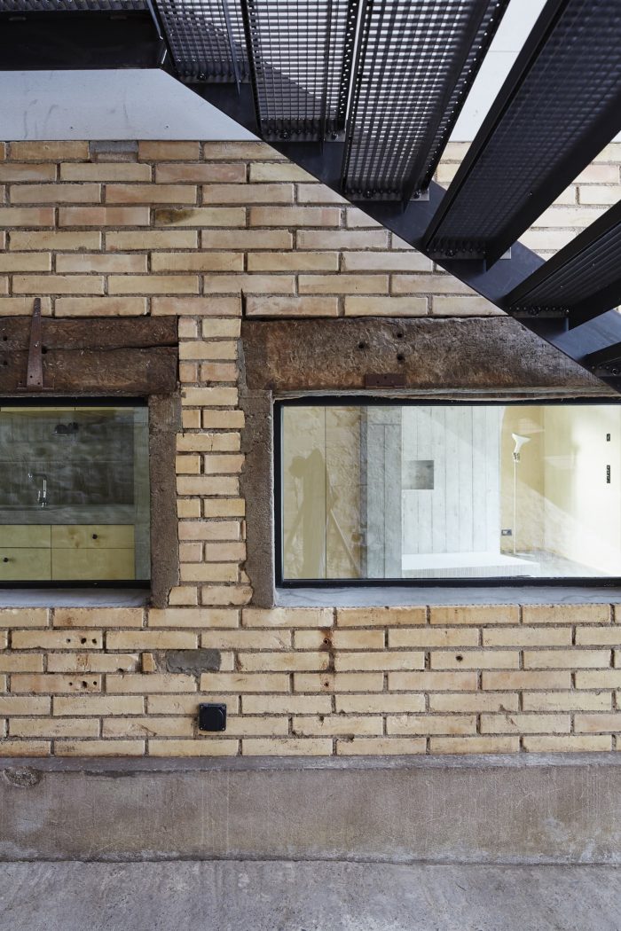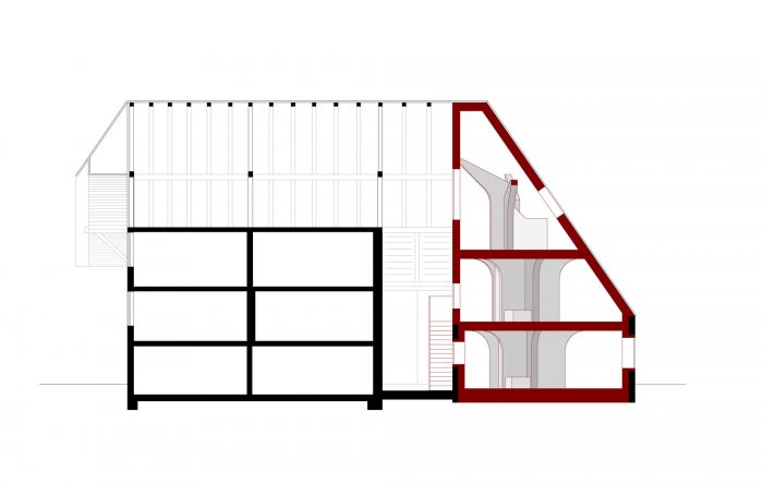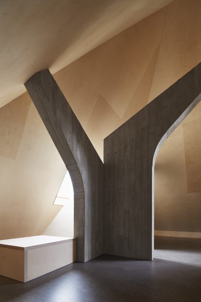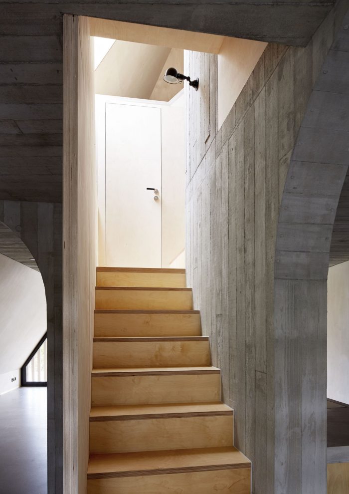 A concrete object now cuts through all three floors and supports the old roof. In addition to its structural qualities, it holds all the bathrooms and kitchen accommodations, as well as cabinets and storage space. Large windows open up the view into the impressive attic.