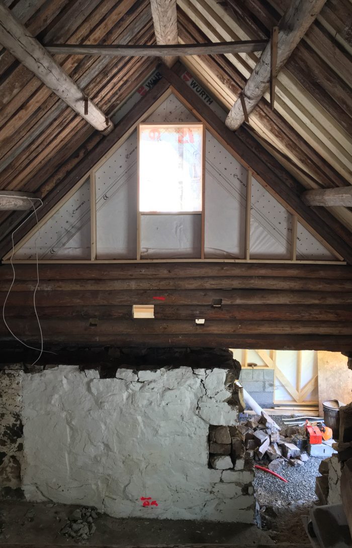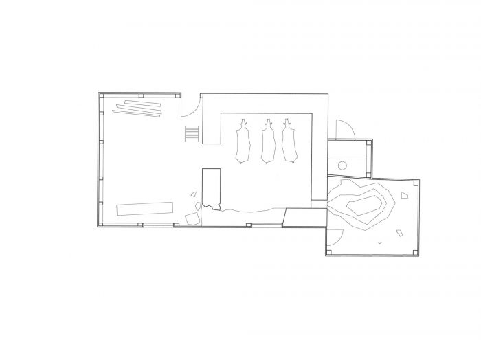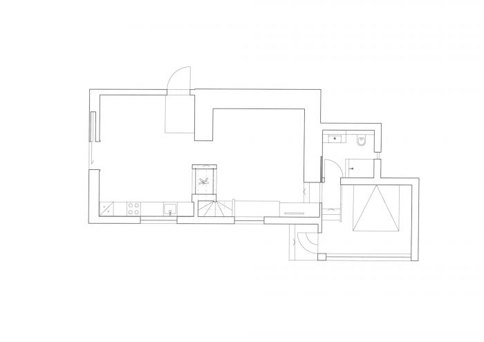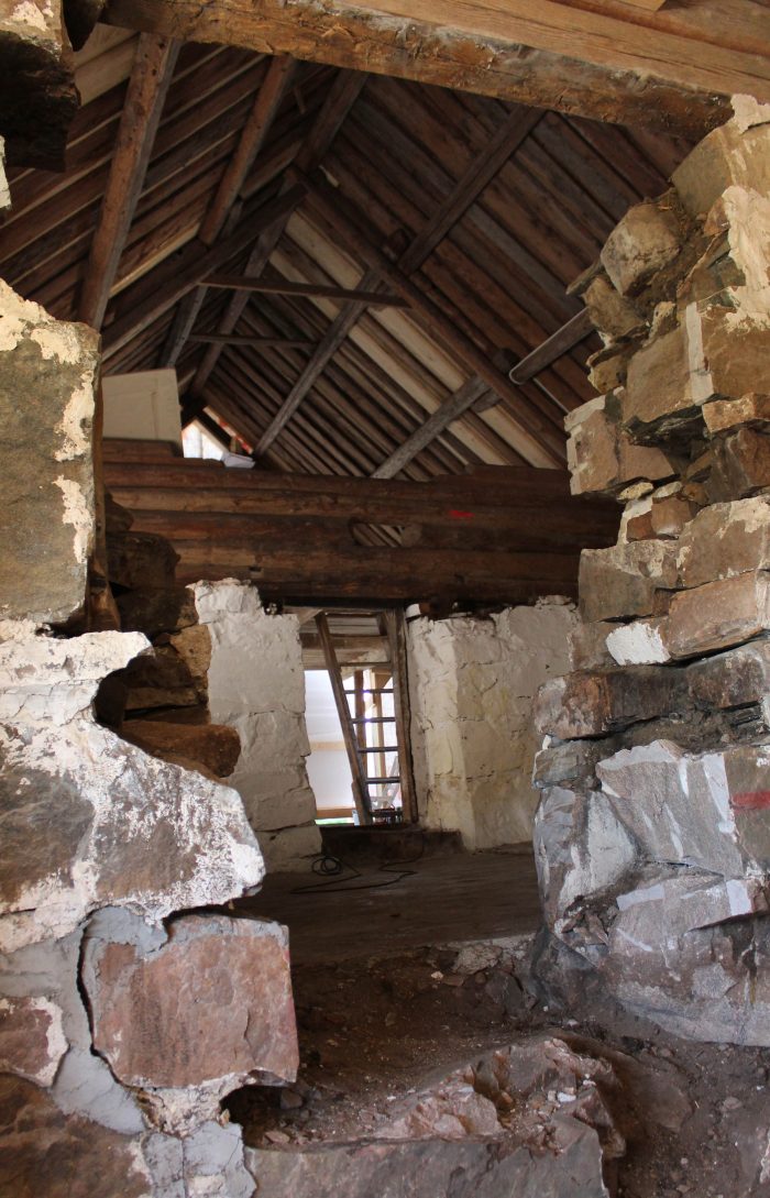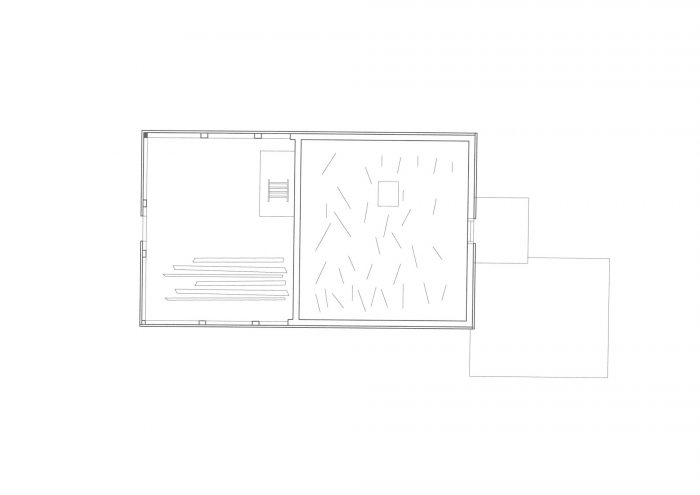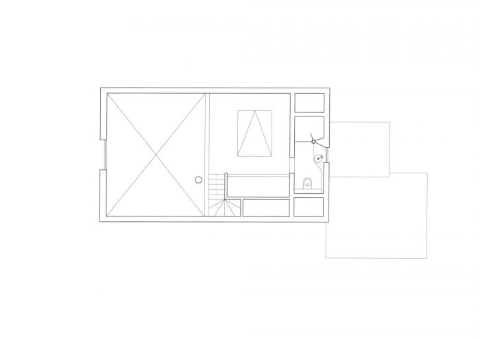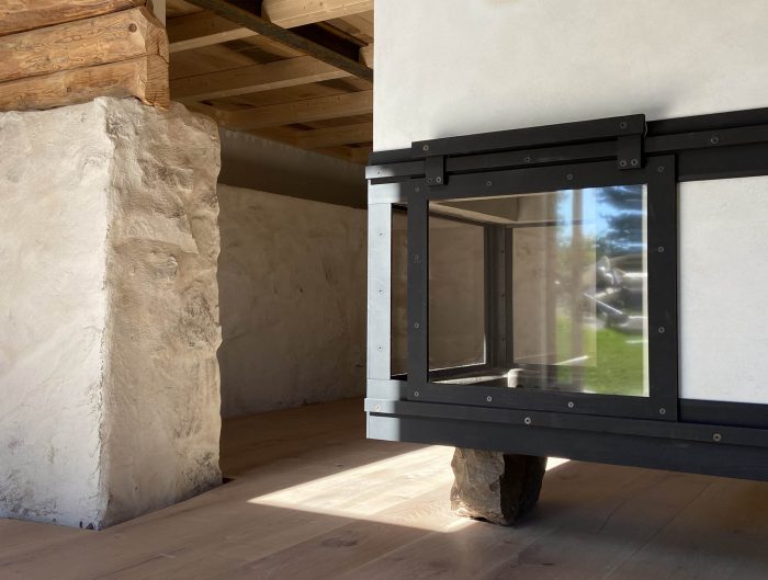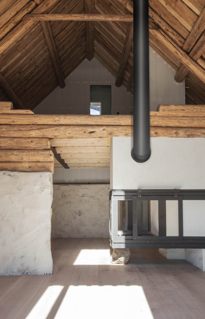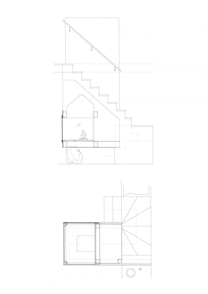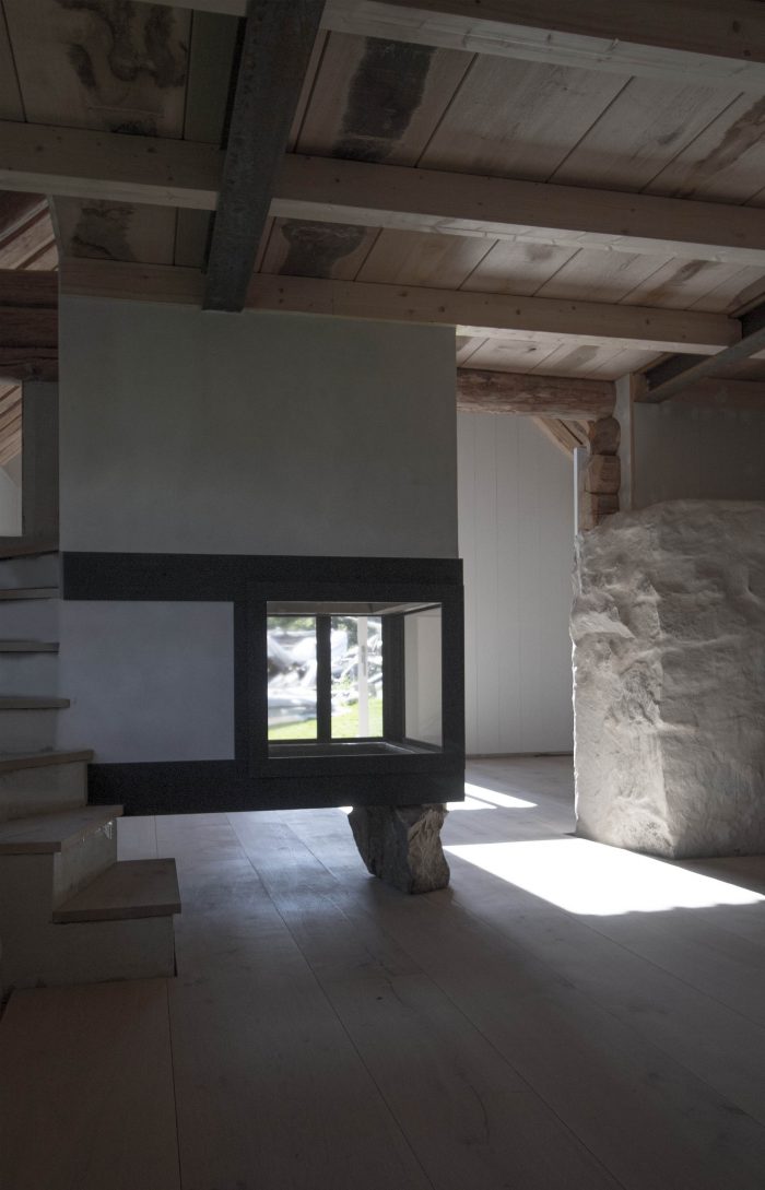 The bulky mass of masonry and stone that make up the fireplace also contains stairs and storage and replaces a dilapidated stone wall - leaving one stone in place to act as both structural support and object “as found”.