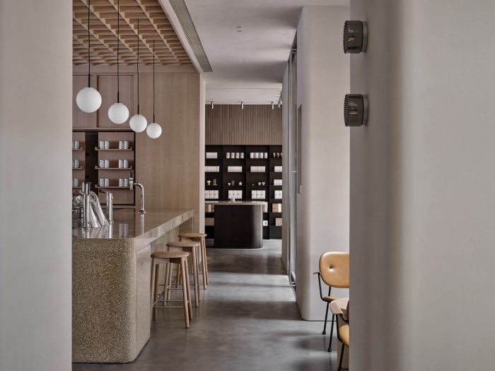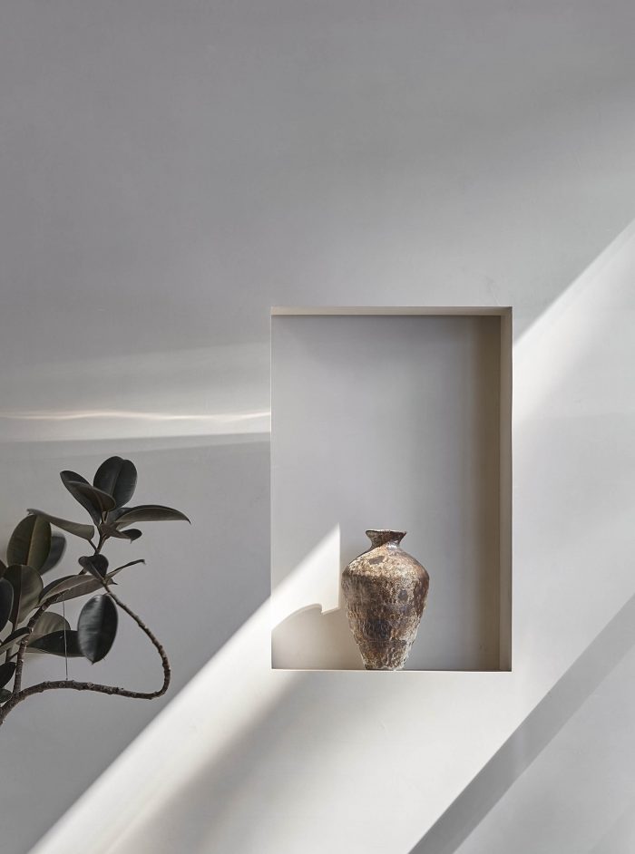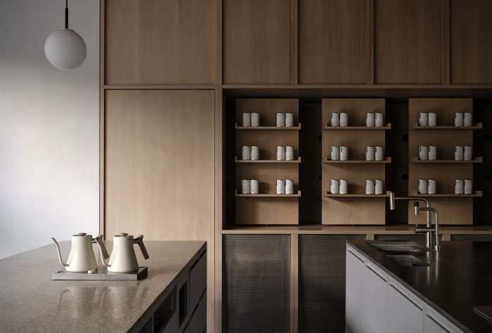 为了实现不同程度的隐私,探索空间时的惊喜时刻和明确的功能定义,空间不仅通过光线的使用而分层,而且同样通过各种建筑元素和材料,为不同的场合创造不同的设置;滑入一个内置的沙发,轻轻地垫着,或选择一个有扶手的躺椅,靠着看书;参与和研究知情的工作人员,在宏伟的石头柜台成为日常茶道的一部分。