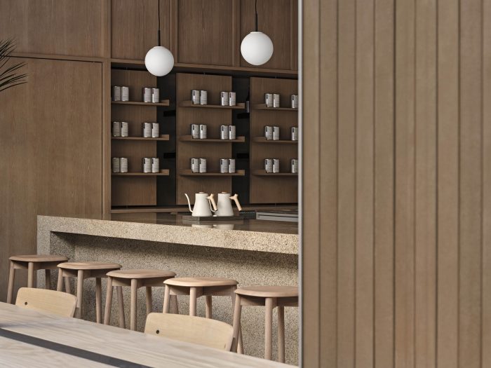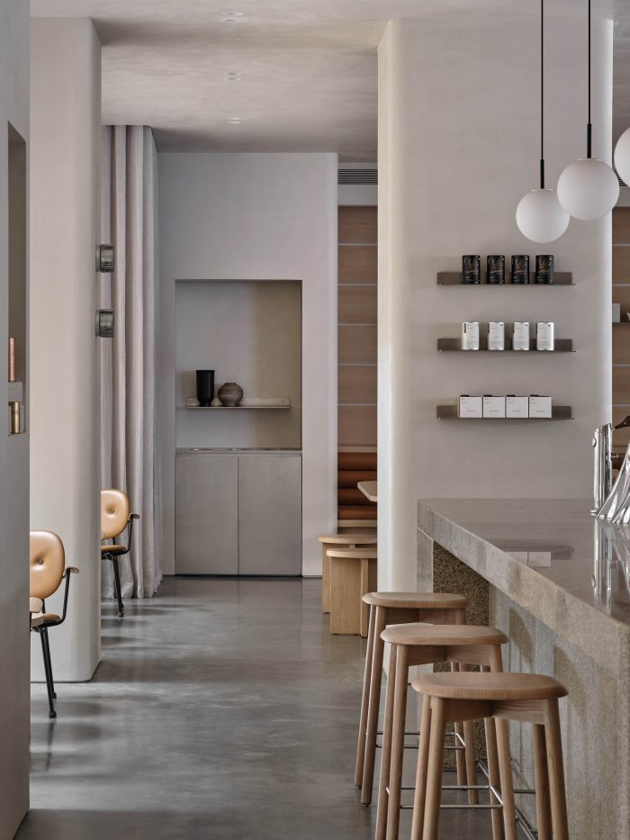 In order to achieve altered levels of privacy, moments of surprise when exploring the space and a clear definition of functions, the space is not only layered through the use of light but just as much with various architectural elements and materials, creating different settings for different occasions; slip into an inbuilt sofa, gently cushioned or choose a reclined chair with armrests to lean back and read a book; engage and study the knowing staff and be part of the everyday tea ceremonies at the grandiose stone counter.
