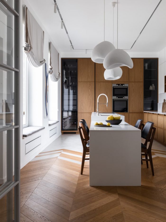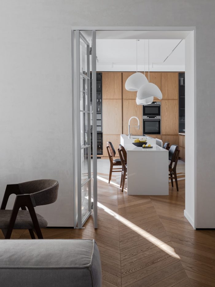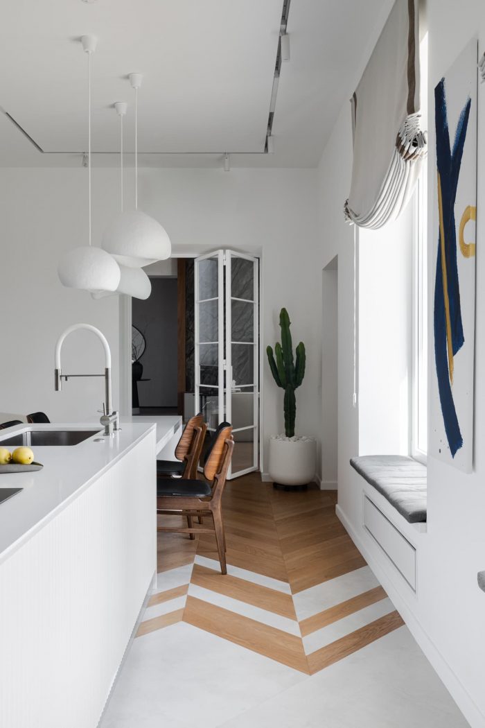 An unusual gradient scheme was used for the kitchen floor to make the transition from porcelain stoneware to parquet. The tiles were cut to repeat the pattern of the parquet, so the transition is very smooth, as if the two flooring materials were mixed.