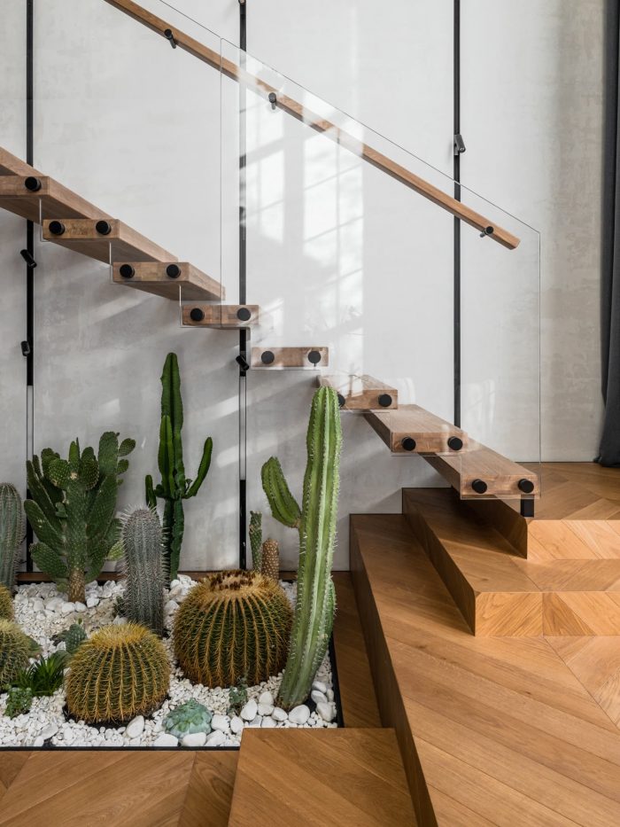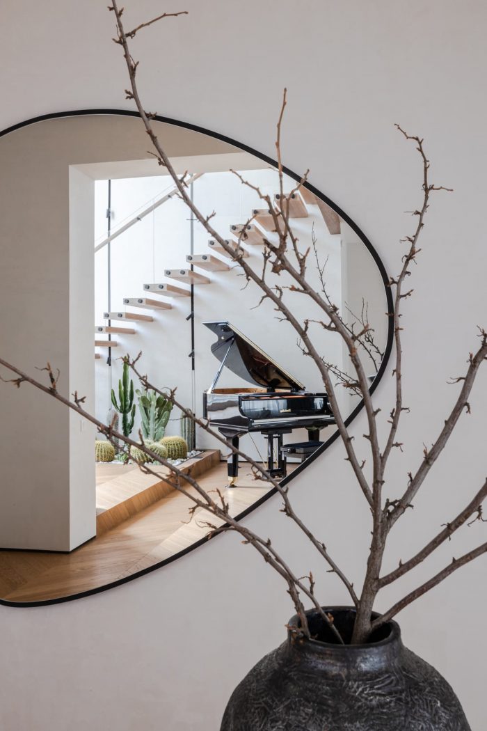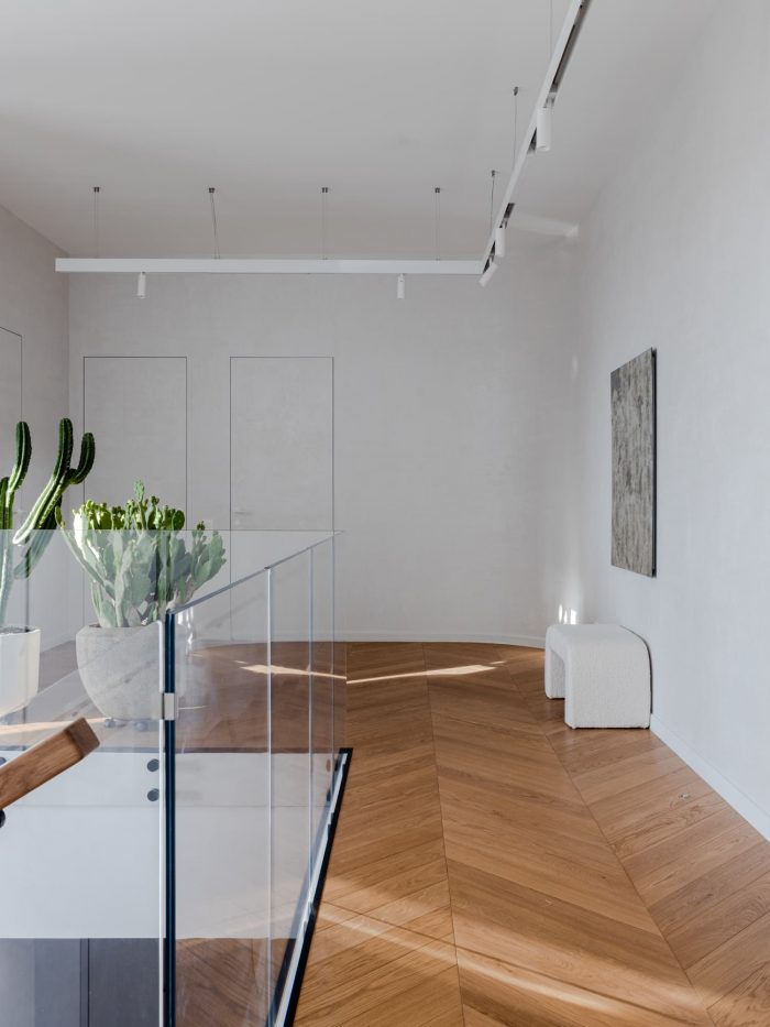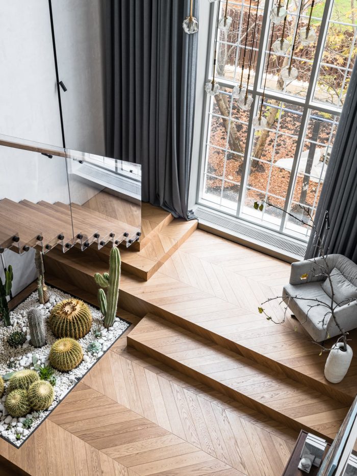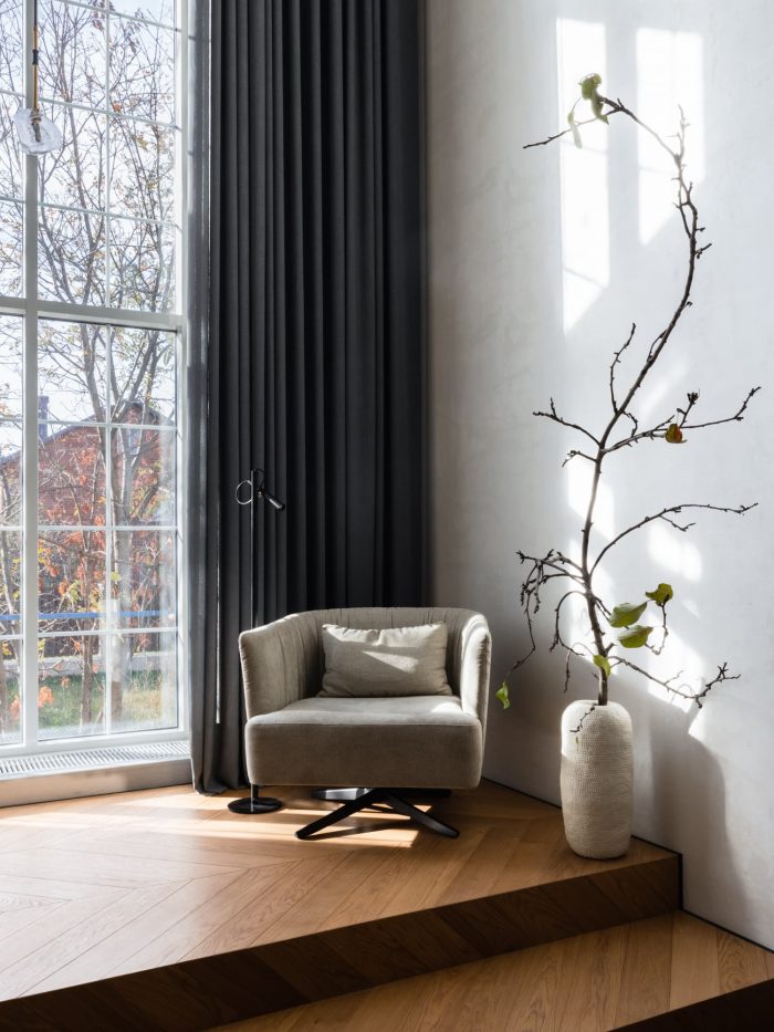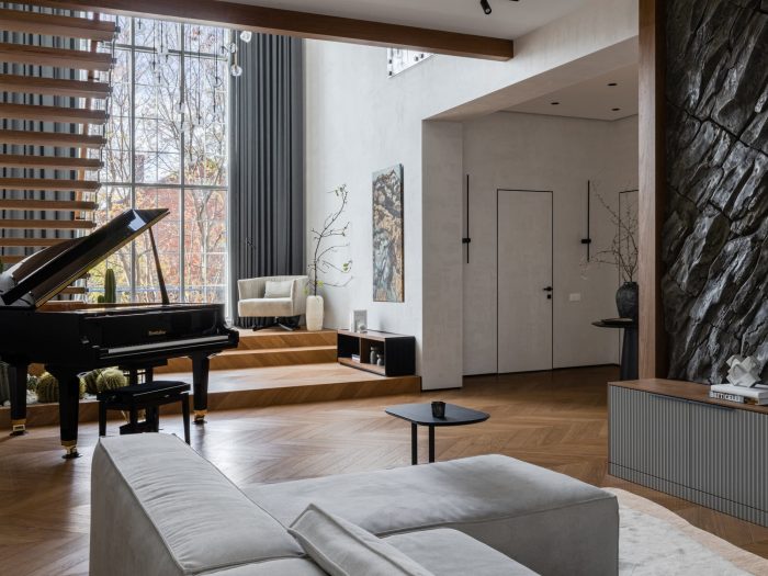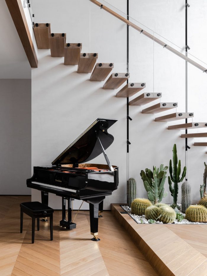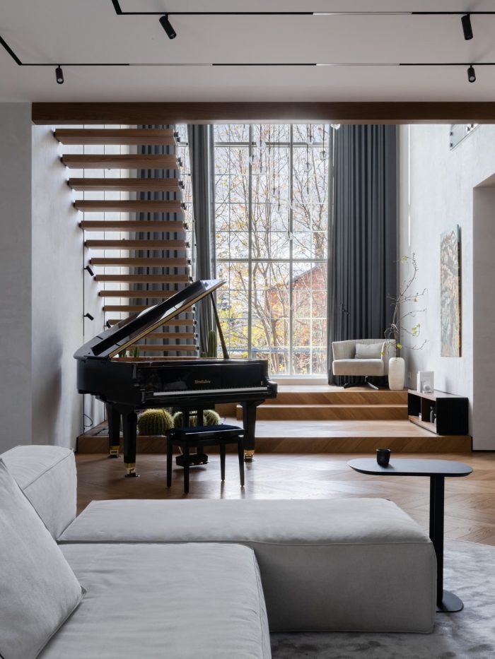 The living space was designed for a young couple, but also provides enough space for a large and harmonious family. The hosts enjoy reading and music, and the master bedroom takes this into account, with a reading area near the 6-meter-high window with comfortable armchairs and a bookshelf for reading the latest literature, plenty of natural light, a grand piano and a mini-garden with exotic cacti and succulents.