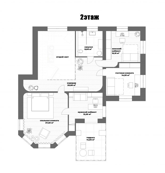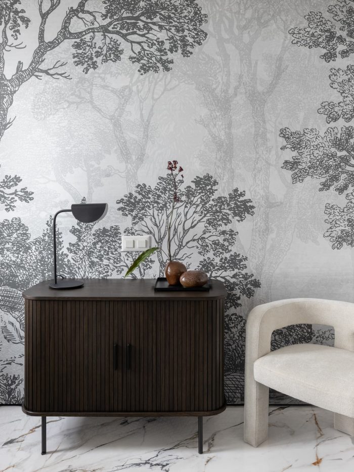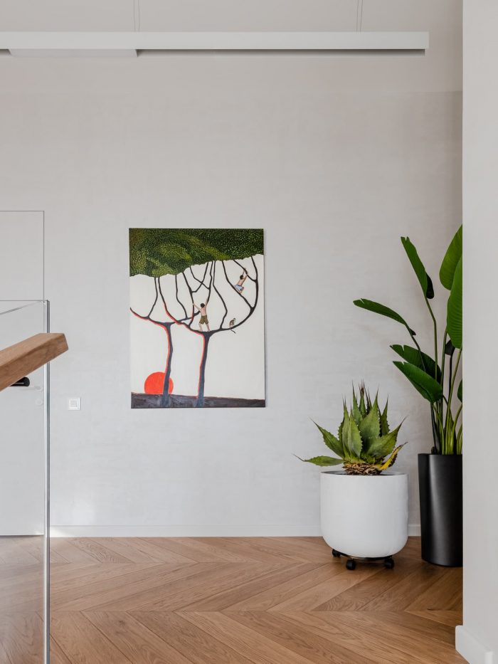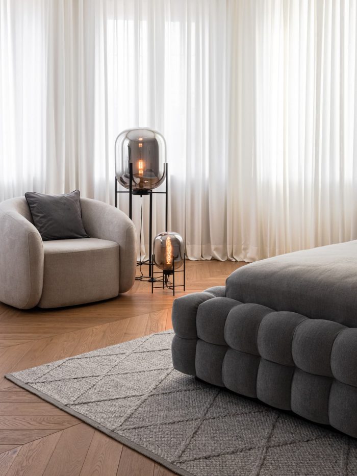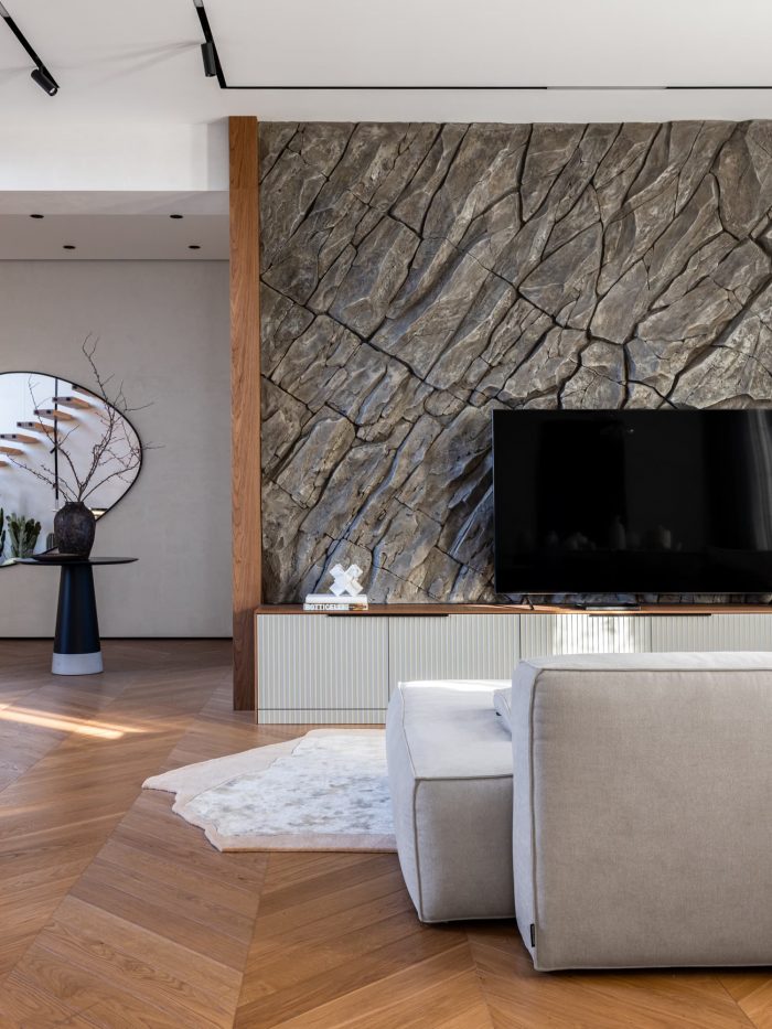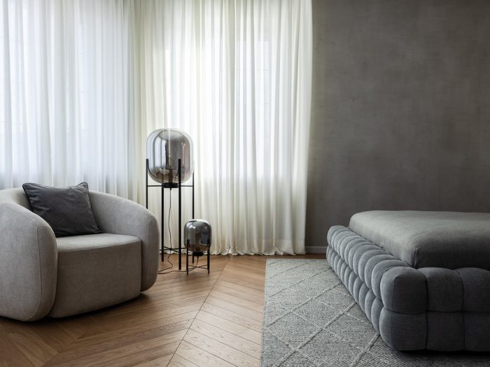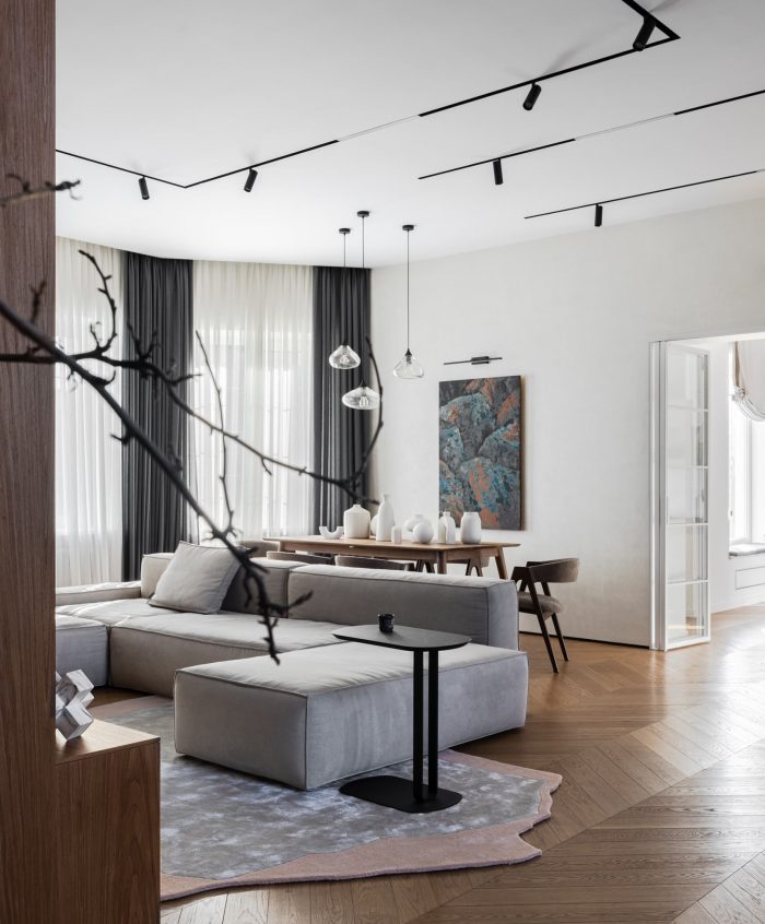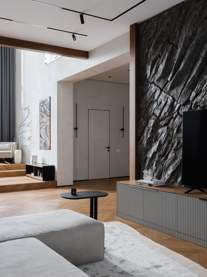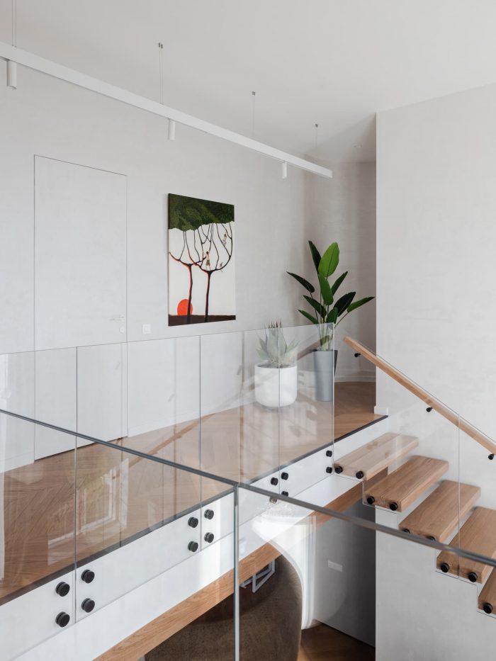 The living space was designed for a young couple, but also provides enough space for a large and harmonious family. The hosts enjoy reading and music, and the master bedroom takes this into account, with a reading area near the 6-meter-high window with comfortable armchairs and a bookshelf for reading the latest literature, plenty of natural light, a grand piano and a mini-garden with exotic cacti and succulents.