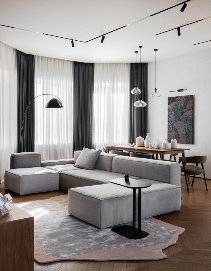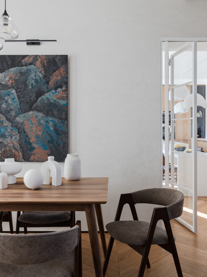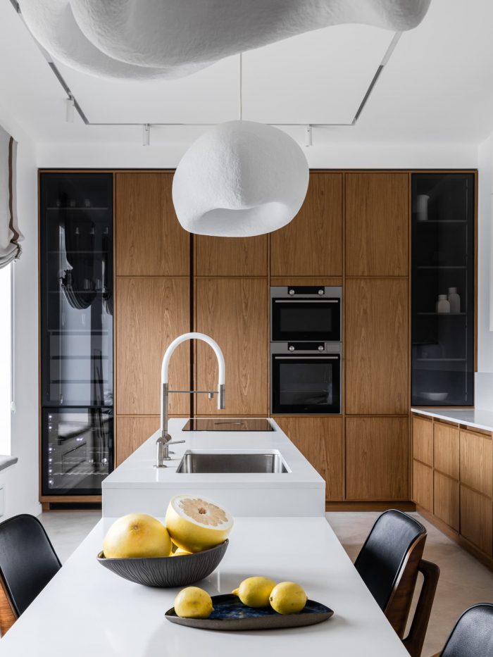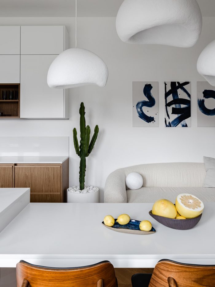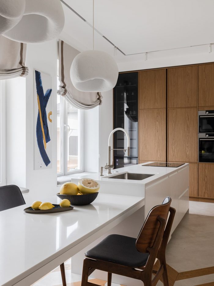 A sofa is placed behind the dining area so you can relax and socialize in the kitchen on cozy evenings. The fabric of the sofa is vandal resistant to prevent colorful products (wine, coffee, etc.) from spoiling. Above the sofa there are three paintings, one of which is the Buddhist Enso Circle, which expresses the desire for perfection, harmony and the realization of goals. The choice depends on the client's philosophy.