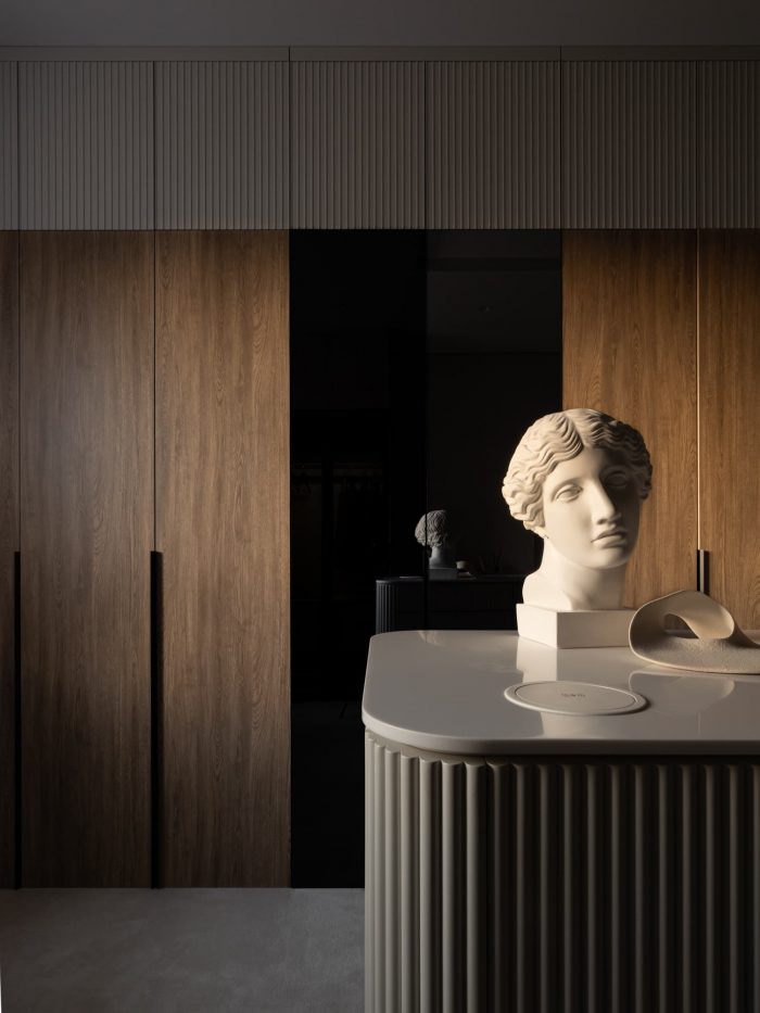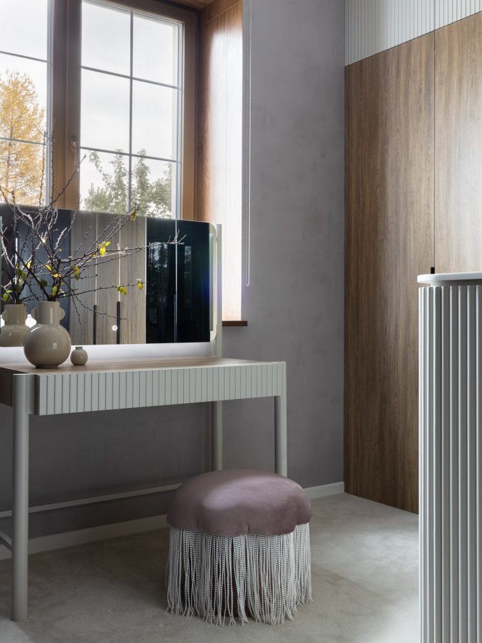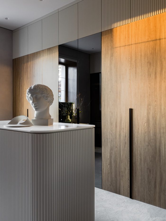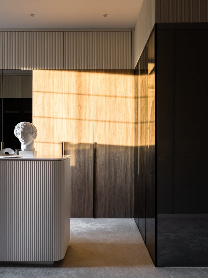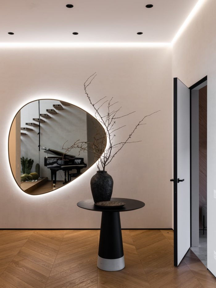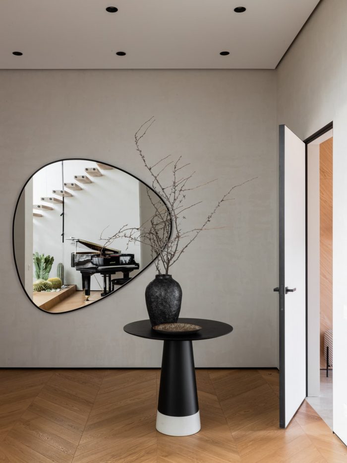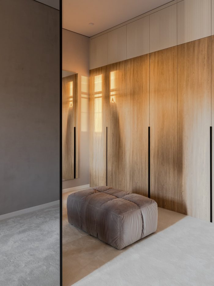 衣帽间的入口位于公共走廊,走廊上有一个 Velk 区和一面不规则形状的镜子,从这里还可以通往主浴室。