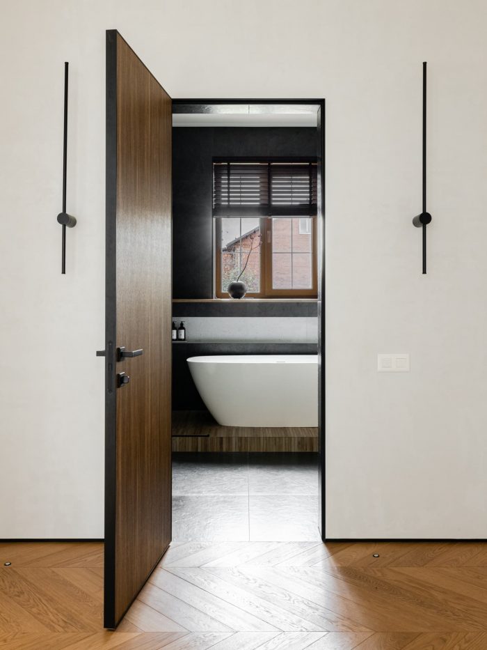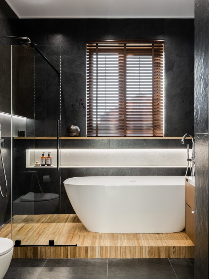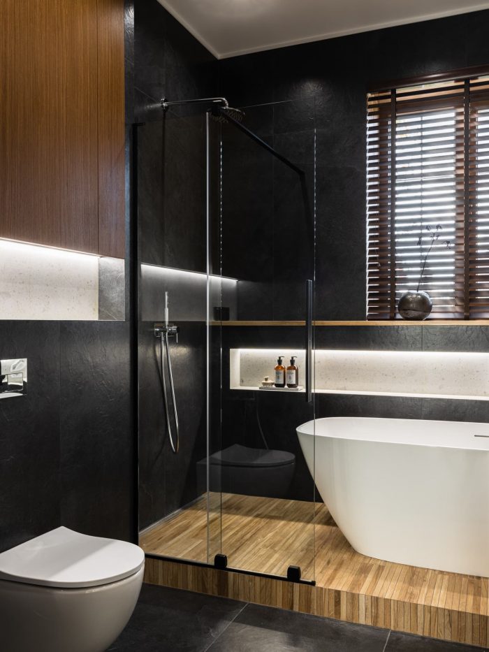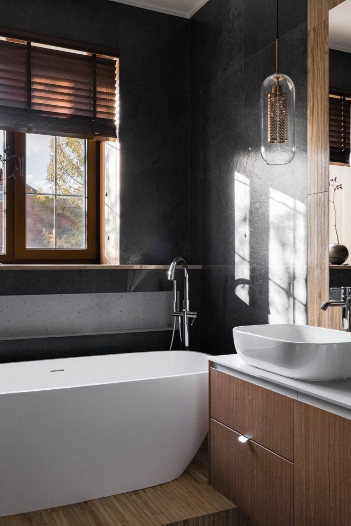 The master bathroom combines a wood pattern with black porcelain tiles with a stone effect and texture. The shutters on the windows allow you to bathe in daylight while minimizing the risk of being seen from the street, and the rays of the setting sun splash onto the mirrors, creating a stunning light effect. There is also a freestanding bathtub and shower with a sliding glass partition. After a bath in the tub, you can shower in comfort. Freestanding bathtubs without a partition or curtain often make you uncomfortable when showering due to splashing water; the bathtub here solves this drawback. There is a shelf on the wall next to the tub for storing cosmetics and candles.