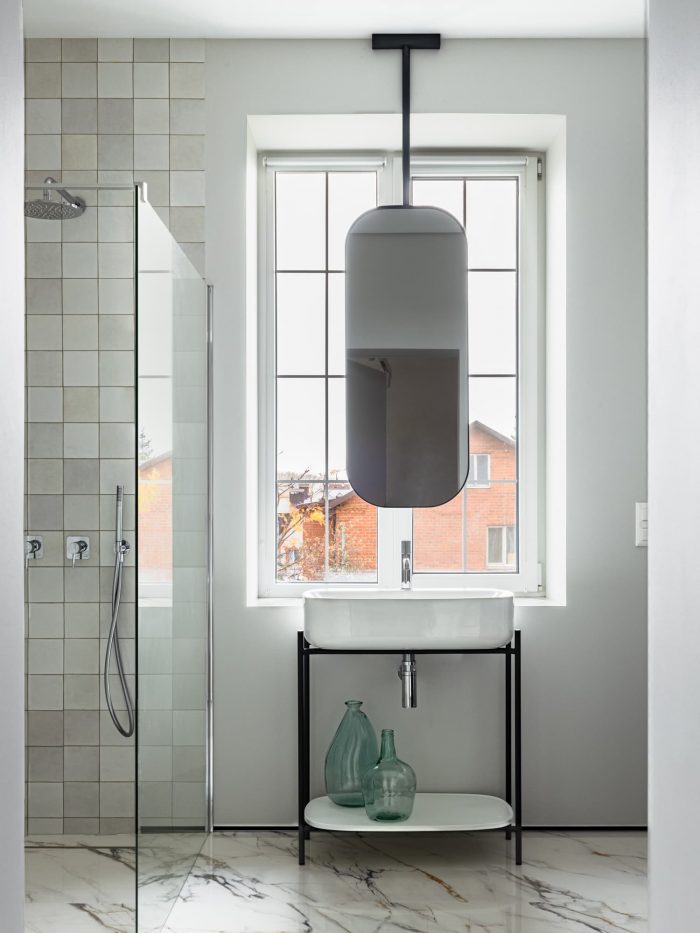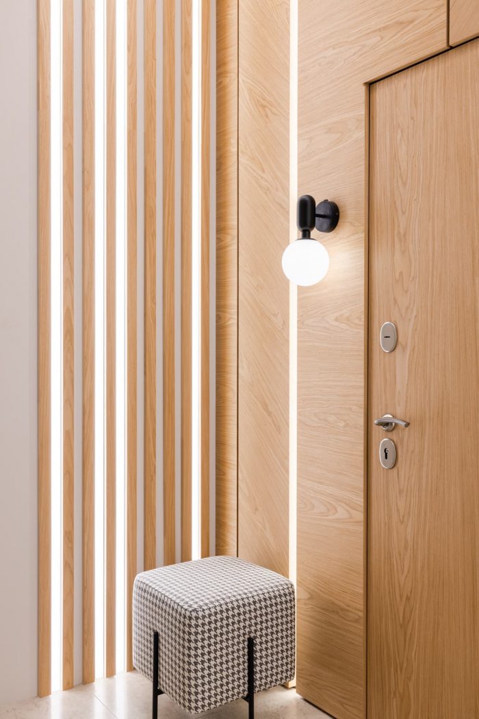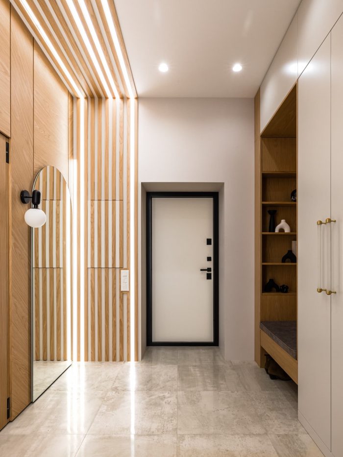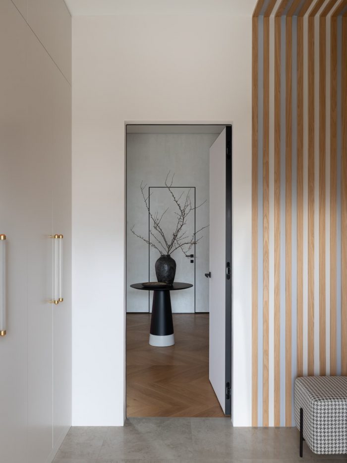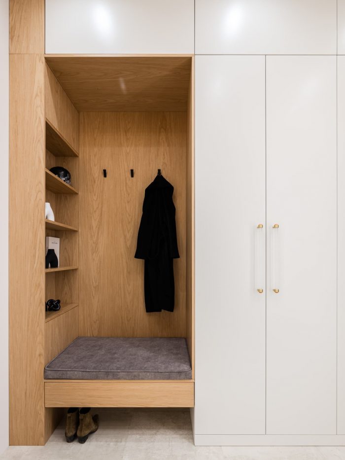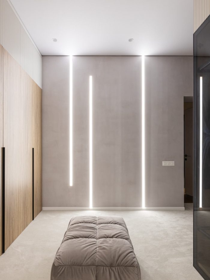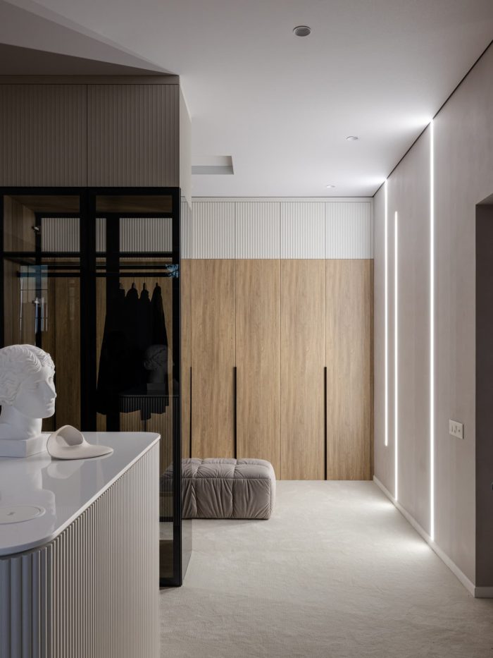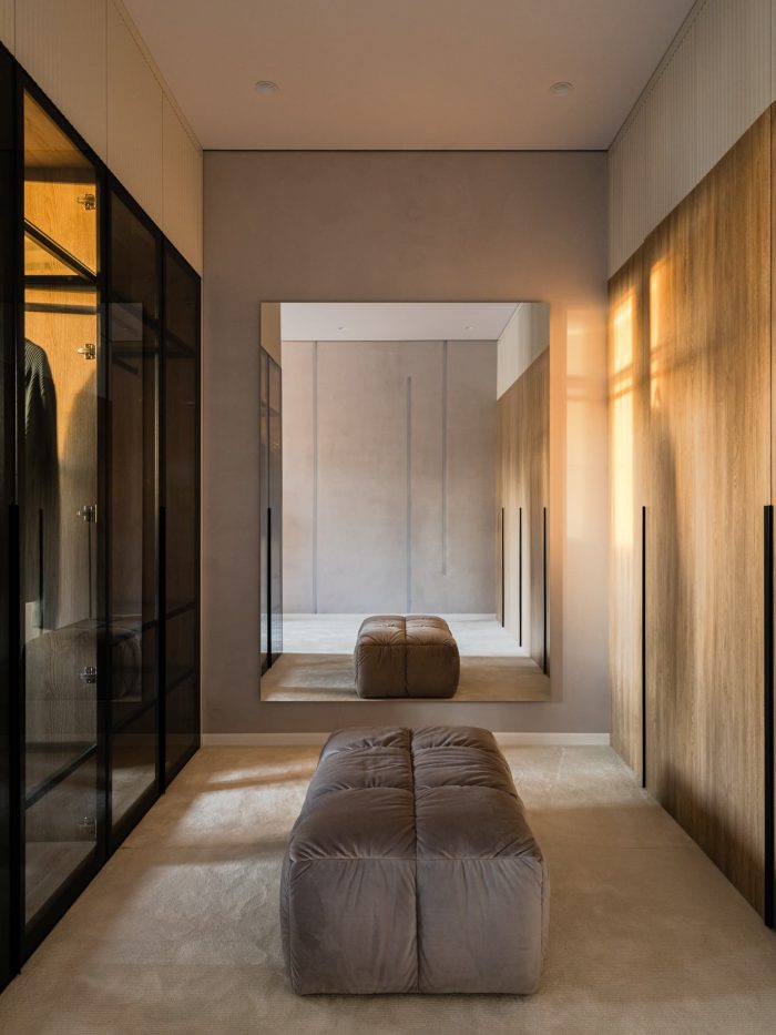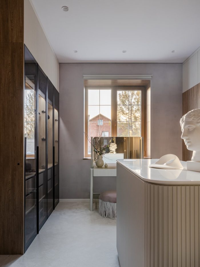 At the other end of the first floor is a 30 square meter dressing room. During the design of the project, it was decided to eliminate all the storage space in the living room, eliminating cupboards and chests of drawers, to centralize everything in one place and to provide it with the ideal infrastructure and logistics: the checkroom is located at the entrance, next to the large bathroom. The checkroom is located at the entrance, next door to the large bathroom, and the interior is divided into men's and women's sections by a transparent tinted glass closet. As there was a kitchen before, the checkroom has a water supply system, so it is possible to place a sink for washing shoes and for other household needs. There is a naturally lit dressing area close to the window and the interior lighting combines sharp lamps, light contours and even matte illumination to give a more comfortable feel for the chosen combination of clothes.