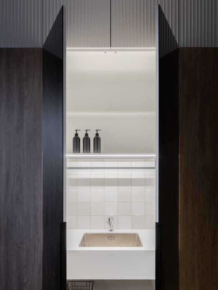 所有的衣架都被设计成封闭式橱柜,其中隐藏着足够数量的抽屉和导轨,用于垂直存放衣物,此外还有熨衣板和蒸箱。女装区中央是一个抽屉柜,用于存放饰品和较小的衣柜物品。此外,还有一个隐藏式插座,可在需要时插入电器。洗衣区位于 1 楼。