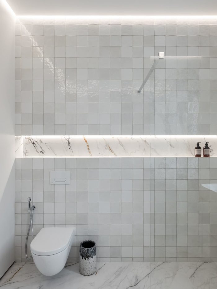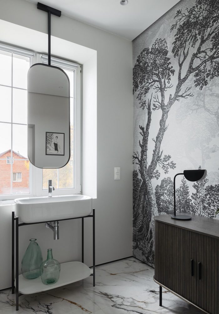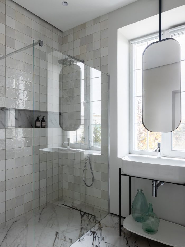 There is also a private bathroom on the second floor. The bathroom is finished in light colors and is for the master's use only. The design is based on the theme of nature, i.e.: murals with natural motifs are used in the decor and the combination of marble and wood. Spanish tiles have been used for the walls, which are made according to pure craftsmanship, with uneven surfaces and unusual iridescent colors; in the niches, as well as on the first floor, there is a niche for cosmetics and candles.