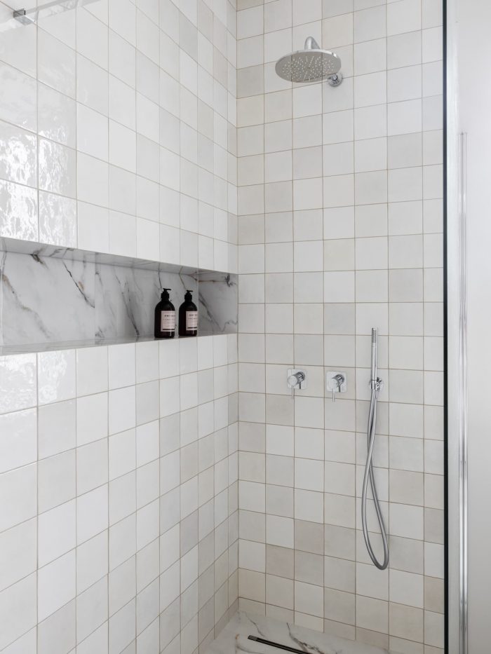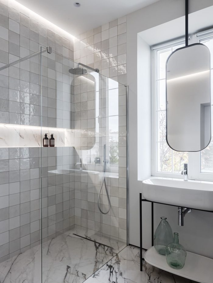 二楼还有一间私人浴室。浴室采用浅色装饰,仅供主人使用。设计以自然为主题,即:在装饰和大理石与木材结合的设计中,采用带有自然图案的壁画。墙壁使用了西班牙瓷砖,这种瓷砖是根据纯正的工艺制作而成,表面凹凸不平,呈现出不寻常的彩虹色;在壁龛里以及一楼,都有一个壁龛,用于存放化妆品和蜡烛。