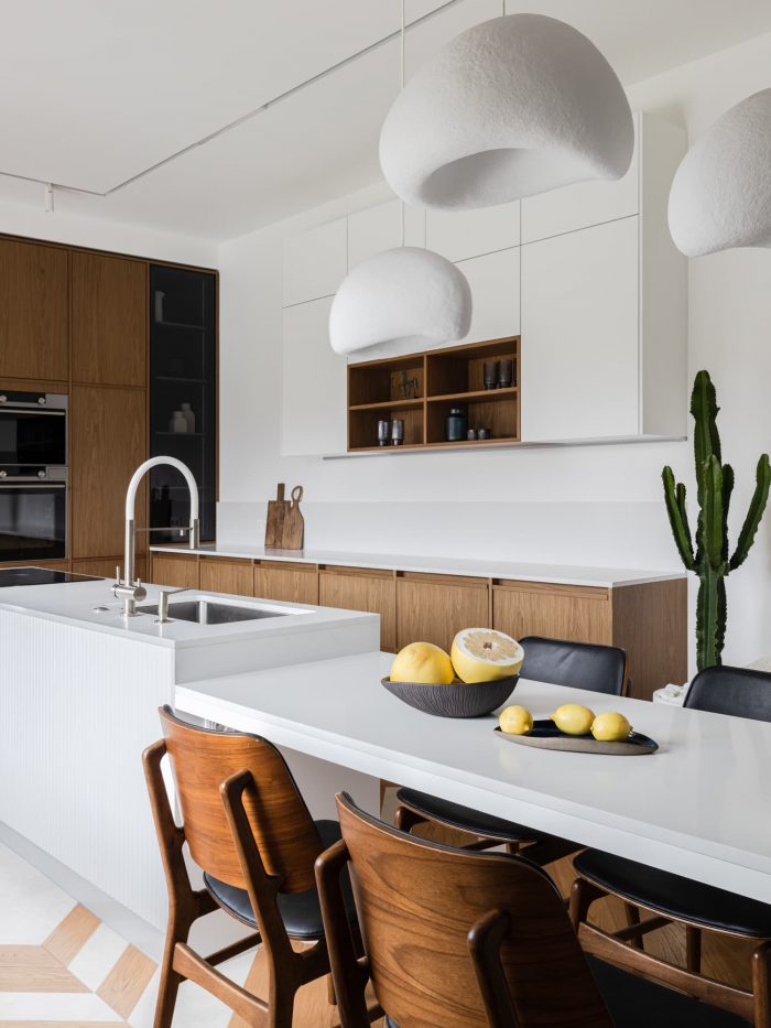 厨房远处的墙壁采用了对比鲜明的木色,内有一个带蒸箱的烤箱、两个冰箱、一个酒柜和储藏空间。所有台面均由石英碎块制成。