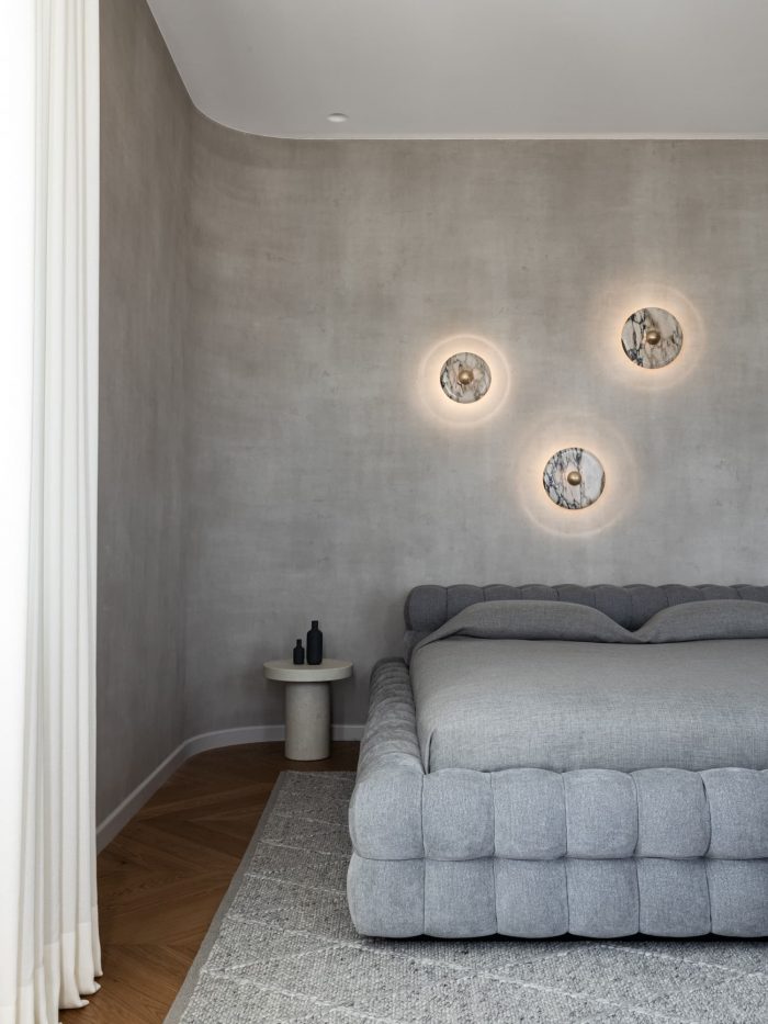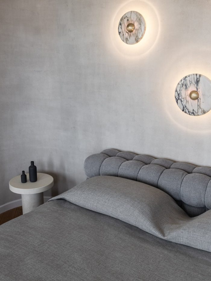 卧室的造型也融入了房屋的整体风格。床头的壁灯由天然大理石制成。房间的设计理念就是为睡眠和放松提供一个不受干扰的私密空间。这里摆放着一张大床、一把阅读椅和一盏由两个玻璃胶囊组成的台灯。天花板采用双层设计,以实现不同寻常的被动照明。主卧室与主人办公室相连。