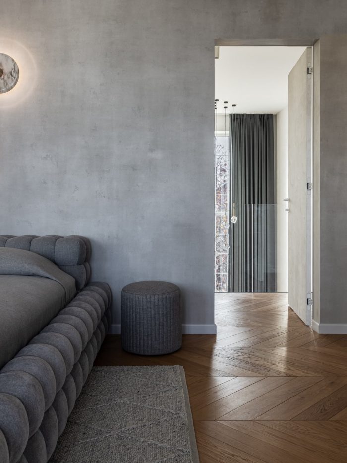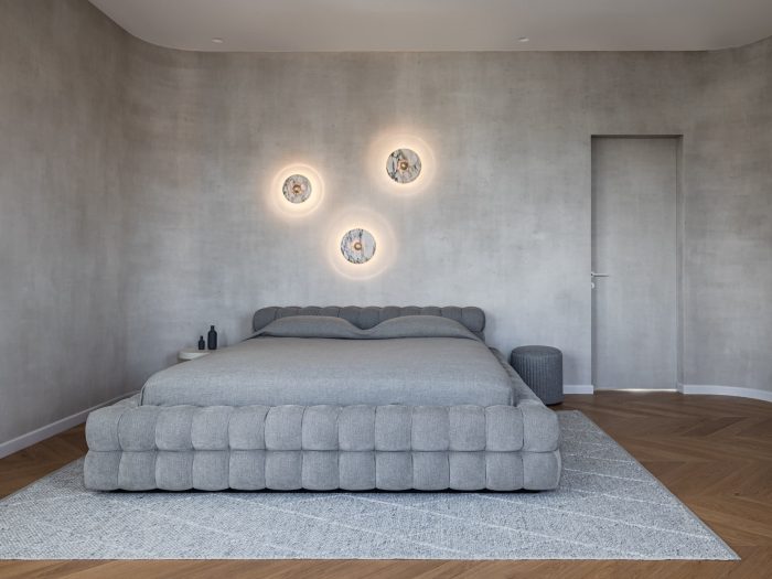 The bedroom is also styled to blend into the overall style of the house. The wall sconces above the bed are made of natural marble. The room was designed with the idea of providing an undisturbed, private space for sleeping and relaxing. It is furnished with a queen-size bed, a reading chair and a table lamp made of two glass capsules. The ceiling is double-layered for unusual passive lighting. The master bedroom is connected to the master office.