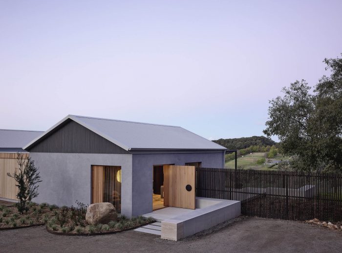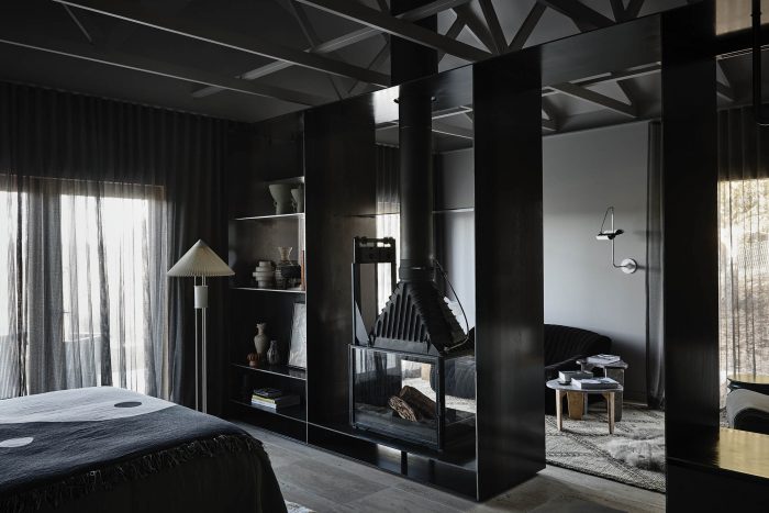 The project involves the reinvention of two existing cabins to create one single luxury private suite and artist studio. The suite itself has been boldly carved into two halves. The entry side contains a kitchen and breakfast nook, as well as a cozy lounge. The remaining side is more private and features a bedroom and striking ensuite.