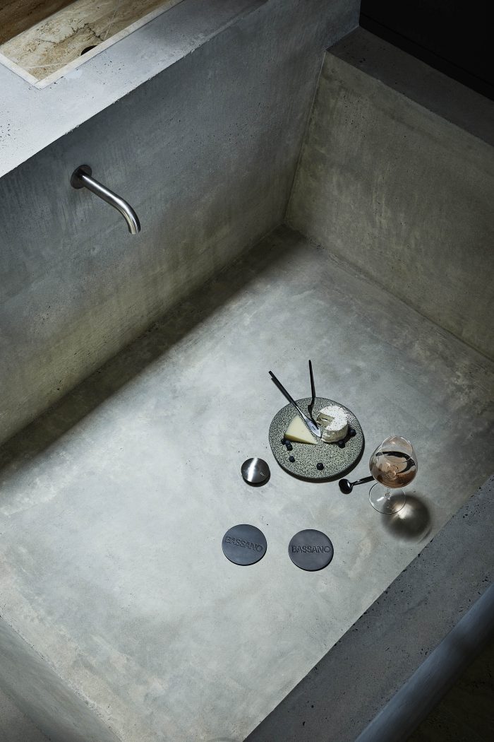 Bassano is unique and full of unexpected experiences. In direct contrast with the soft rural exterior architecture, the interior delicately balances bold brutal ideas with delicate detail design. In particular, the featured concrete bath and basin are proudly centered in the space and are theatrically illuminated from above. The concrete texture compliments the travertine flooring and is both robust and permanent.