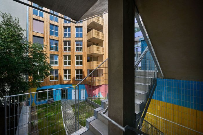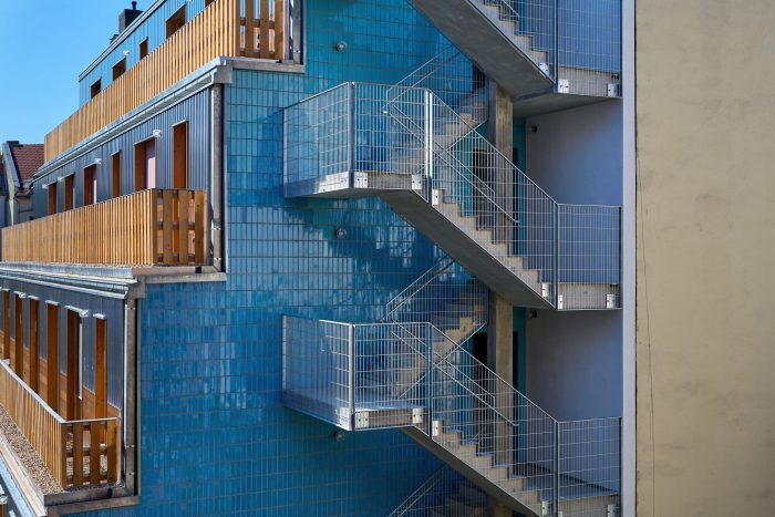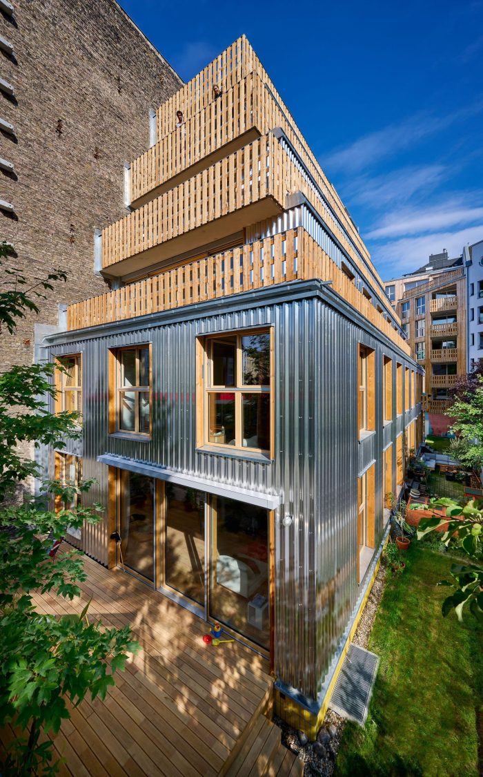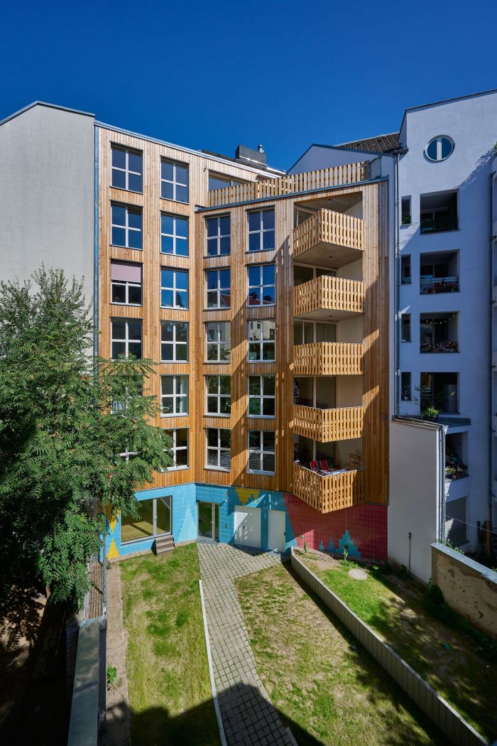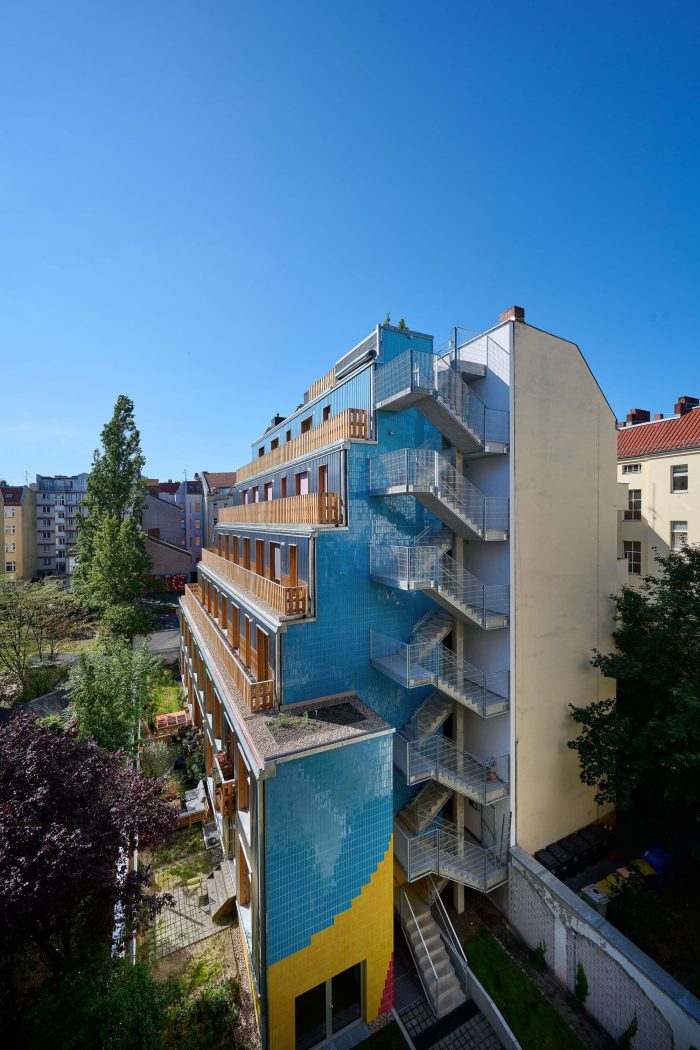 The glazed clinker brick slips were sourced from a local manufacturer near Berlin. A cheerful, brightly colored design on the base of the front building and fire wall of the garden house becomes a unifying element to both buildings. Non-combustible cladding was not only necessary on the walls surrounding the fire escape, but also the entire facade. Therefore, in addition to the clinker brick slips, untreated (and hence 100% recyclable) corrugated aluminum sheeting was selected for the rest of the facade. Wood was approved for the outer wall itself, as well as balconies and windows, allowing the front and rear building to speak to each other not only via the window design, but also through the material. Colored fabric awnings complete the picture.