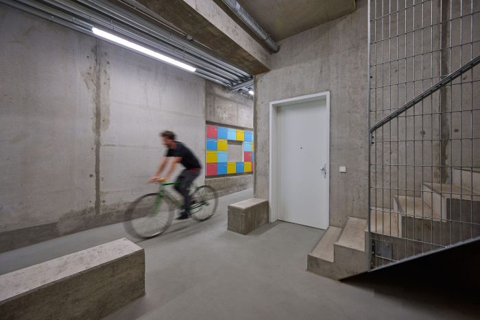 为以后提供合并或拆分公寓的选择是有代价的(生态)。由于每层楼的墙体都是偏移的,木质承重天花板和墙体的建造会更加复杂和昂贵,特别是在隔音要求方面。出于这个原因,我们选择了混合结构,将固体结构与木质围墙结合起来。坚固的结构可以在中央通道中看到,暴露在外的钢筋混凝土为建筑中最经常使用的空间提供了必要的坚固性。快速和方便:前楼的自动门提供了通往中央通道的通道。略微倾斜的大厅将自行车、婴儿车和助动器毫不费力地经过彩色邮箱直接引向花园住宅地下室的停车区。由于柏林对提供充足的非机动车停车位的规定,人们认为没有必要为汽车提供地下停车位--事实上,由于许多原因,人们并不希望这样。这不仅节省了二氧化碳和财务成本,而且从一开始就是实现绿色庭院的唯一因素。