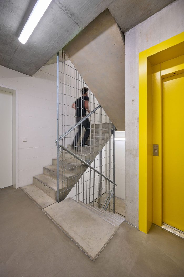 The staircase in the front house is a reduced, solid construction, without any unnecessary finishes. Reinforced concrete and unrendered sand-lime brick, painted white, characterize the look. The elevator doors bring tones from the clinkers on the facade into the house and provide splashes of color on all floors. The building services concept is based on an exhaust-air heat pump that generates domestic hot water from the exhaust air of the apartments and provides passive air exchange via external air vents. The system is combined with district heating and photovoltaic modules on the roof to support the operation of the heat pump.