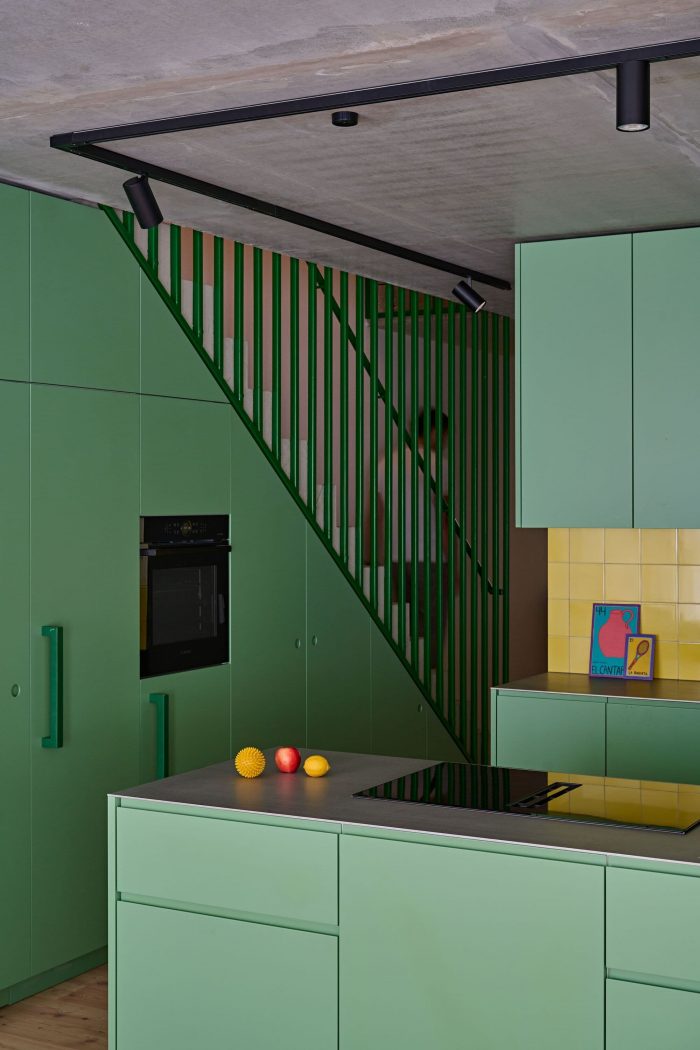 In the same maisonette, the kitchen was designed to match the staircase. As a healthy material for living spaces, spruce coloured with pure linseed oil paint was used for the fixtures. In a smaller apartment in the garden house, the kitchen was designed in a similar way. A purposefully placed mirror enlarges the space.