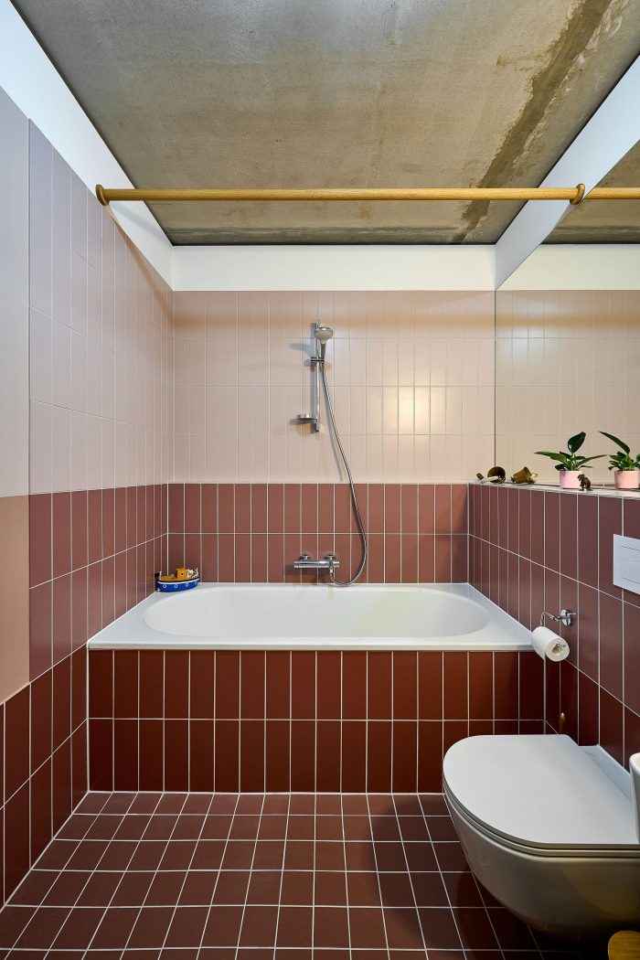 The bathrooms were just as individual. Starting with a standard tile available in many different colors and formats, a multitude of designs was possible. These 10x30cm tiles in three color gradients were laid vertically. Another bathroom with shower features gradients of a different color. For this resident, 10x10cm tiles were used to create a colored niche for his bathtub. Other tiles were also available upon request. Here, gray tiles were combined with small, brightly colored niches. The residents could also incorporate their own ideas for the bathroom layouts and fixtures. Here, shower and bath with matching black fixtures were combined with plain white wall tiles and a terrazzo floor.