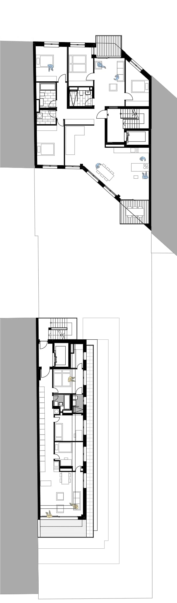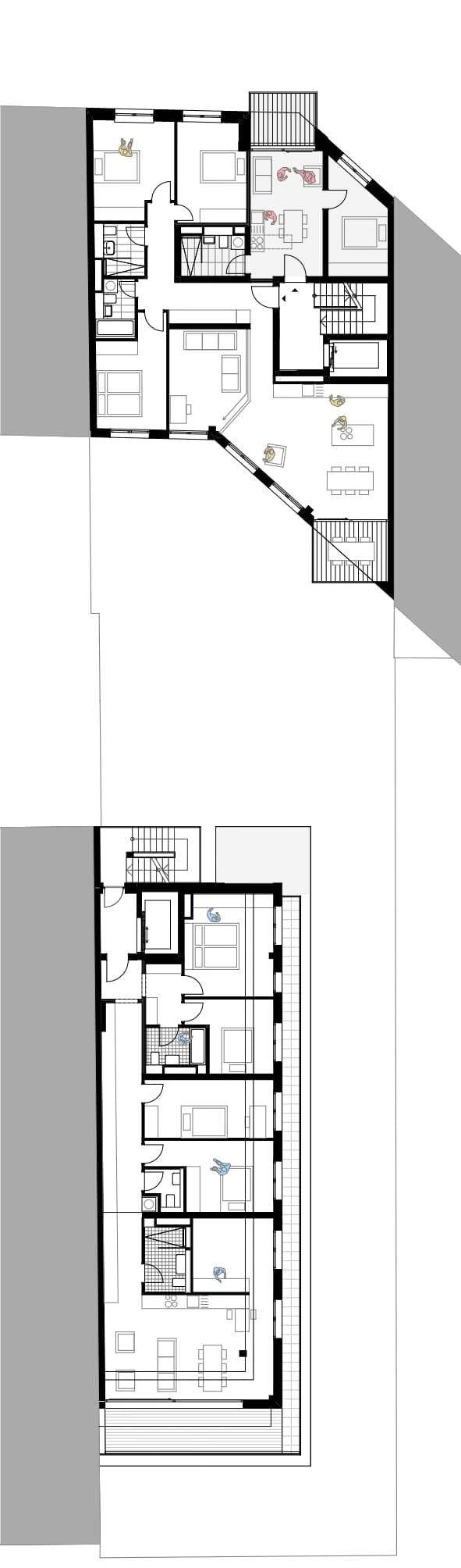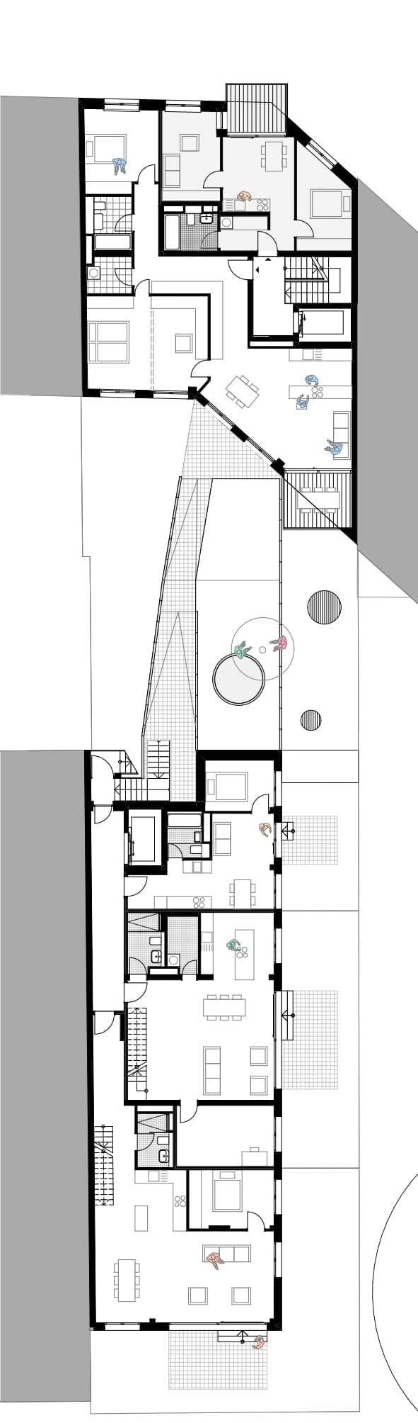 前屋的后面是宽敞的、朝南的阳台,这暗示了一个特殊的特点:前屋的所有住宅楼层都被设计成可以作为一个大公寓或两个小公寓使用。为未来的转换做准备是设计耐用和持久的建筑的一个重要因素。这就是为什么前屋的公寓被设计成可以在以后很容易地被分割或合并。院子里的花园洋房建在现有的防火墙上,高度错落有致,以符合法律规定的后退。朝南和朝东的露台被设计成梯田,以提供最大的户外休闲空间。正如这个从前面的房子到花园房子的景观所展示的那样,即使是防火墙也可以看起来很好! 消防安全法规要求花园洋房前面的开放式消防通道必须由不燃材料包围。通过纳入这一措施,可以避免为消防部门的通道指定空间,因此整个院子可以变成一个花园。自行车和垃圾桶可以存放在地下室,从而保持该区域的不乱。