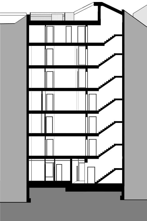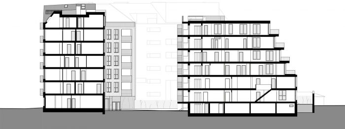 To the rear of the front house are generous, south-facing balconies, which hint toward a special feature: all residential floors of the front house are designed in such a way that they can be used as either one large or two smaller apartments. Provisioning for future conversions is an essential factor in the design of durable and long-lasting buildings. That is why the apartments in the front house have been designed so that they can be easily divided or combined at a later date. The garden house in the courtyard was built onto the existing fire wall and staggered in height to comply with the legally designated setbacks. The south and east facing decks were designed as terraces to provide maximum outdoor amenity space. As this view from the front house to the garden house demonstrates, even fire walls can look good! Fire safety regulations require that the open fire escape on the front of the garden house be surrounded by non-combustible materials. By incorporating this measure, it was possible to avoid designating space for fire department access, so the whole courtyard could be transformed into a garden. Bicycles and wastebins can be stored in the basement, thus keeping the area uncluttered.