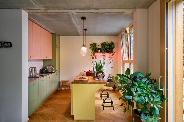 The interiors of the apartments were co-designed by the residents. For the ceilings, there was the option of either a plastered finish or inexpensive, exposed concrete. Residents were also free to choose their own flooring, tiles, bathroom and kitchen fittings.