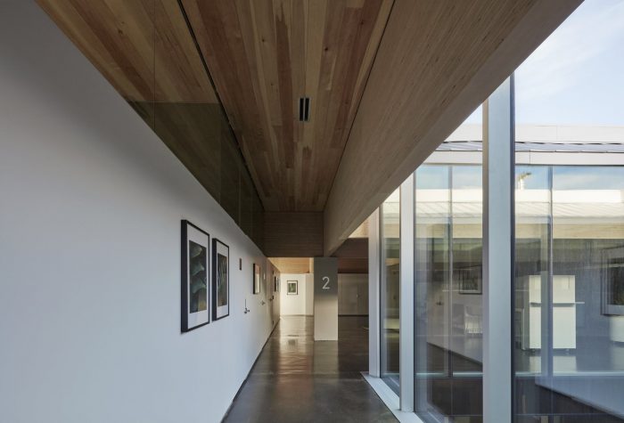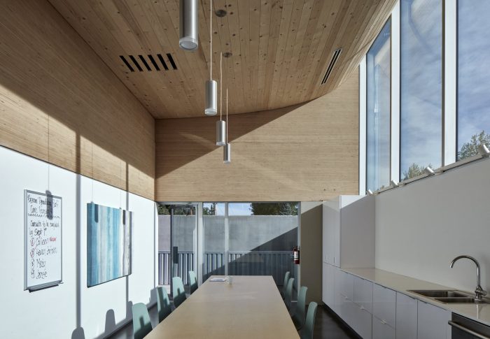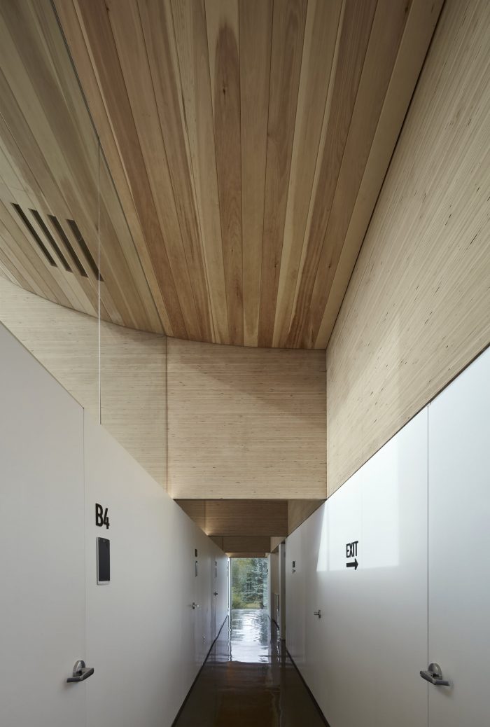 The arc of the wood ceiling not only draws a wash of natural light to the interior from the roofline edge but – visible from neighboring vistas – its appearance is iconic and elegantly bows out of view without compromising the private spaces tucked behind. Further, the high coffered ceiling combined with the mechanical system and natural air convection ensures that warm air remains in the ceiling space while conditioned air circulates in the bottom 7 feet of the space occupied by patients and staff to promote focused and wakeful conditions. Structure and light combine to create an intuitive interior flow for users and transport visitors to an elevated, light-filled environment.