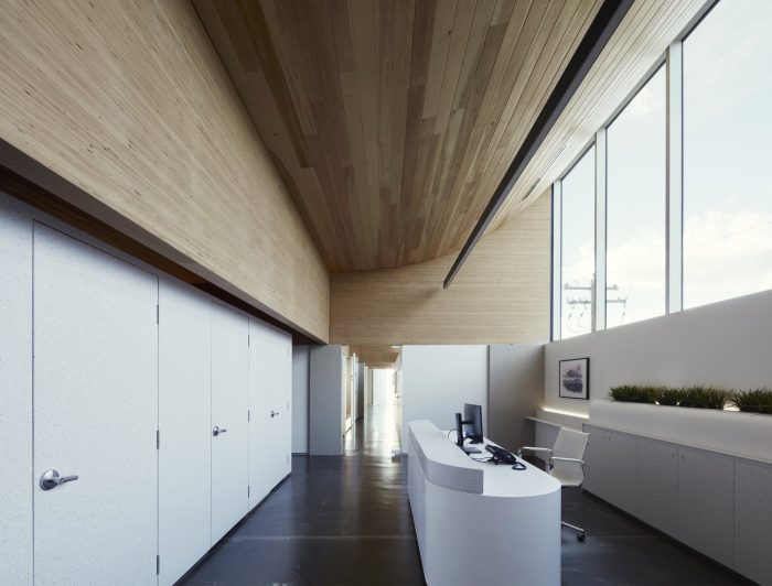 The project's top floor features a sequence of light-filled spaces defined by a wood beam system that offers sound separation between rooms. This coffered system solves a number of functional requirements: it acts as a roof structure that allows large spans and an uninterrupted floor plate, creates intimacy by way of 7- foot thresholds, experienced each time one passes under the 'egg-crate' structure Beacon Clinic, Calgary, Canada and finally, provides a surface that diffuses light via natural material for a warm, tranquil glow.