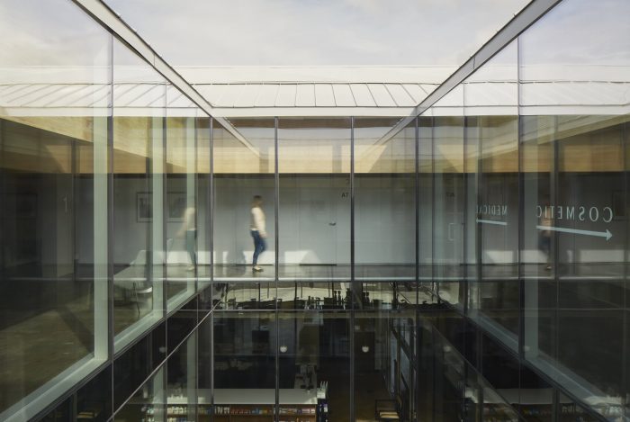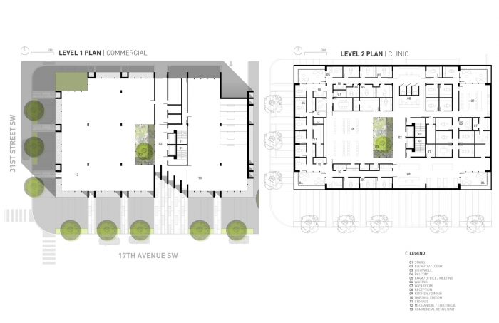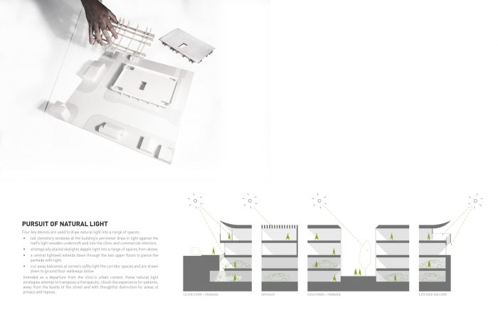 Analysis of the building’s primary function – dermatological clinics require a significant amount of soft natural light for patient assessment and treatment – revealed the importance of light modulation for a variety of processes and procedures at the second-story level. The design evolves around different ways of bringing natural light into the spaces while reducing direct exposure to sun and glare: a tall clerestory perimeter that washes light against the roof’s light wooden undercroft; cut-away balconies at corners that softly light corridor spaces; strategically placed skylights; and a central lightwell that extends down through the two upper floors and pierces the parkade with light.