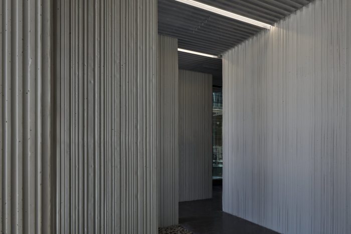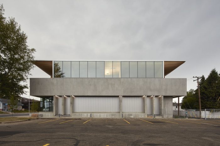 On the street, concrete columns appear thin in profile, support a concrete veil above, and demarcate retail entrances. Intermittently staggered with panels of glazing, the generous transparent planes engage passersby and maximize street frontage. On the second floor, the protective concrete veil wraps the structure, created for privacy and a strong visual break, an acoustic barrier from the street, and an enclosure for building users.